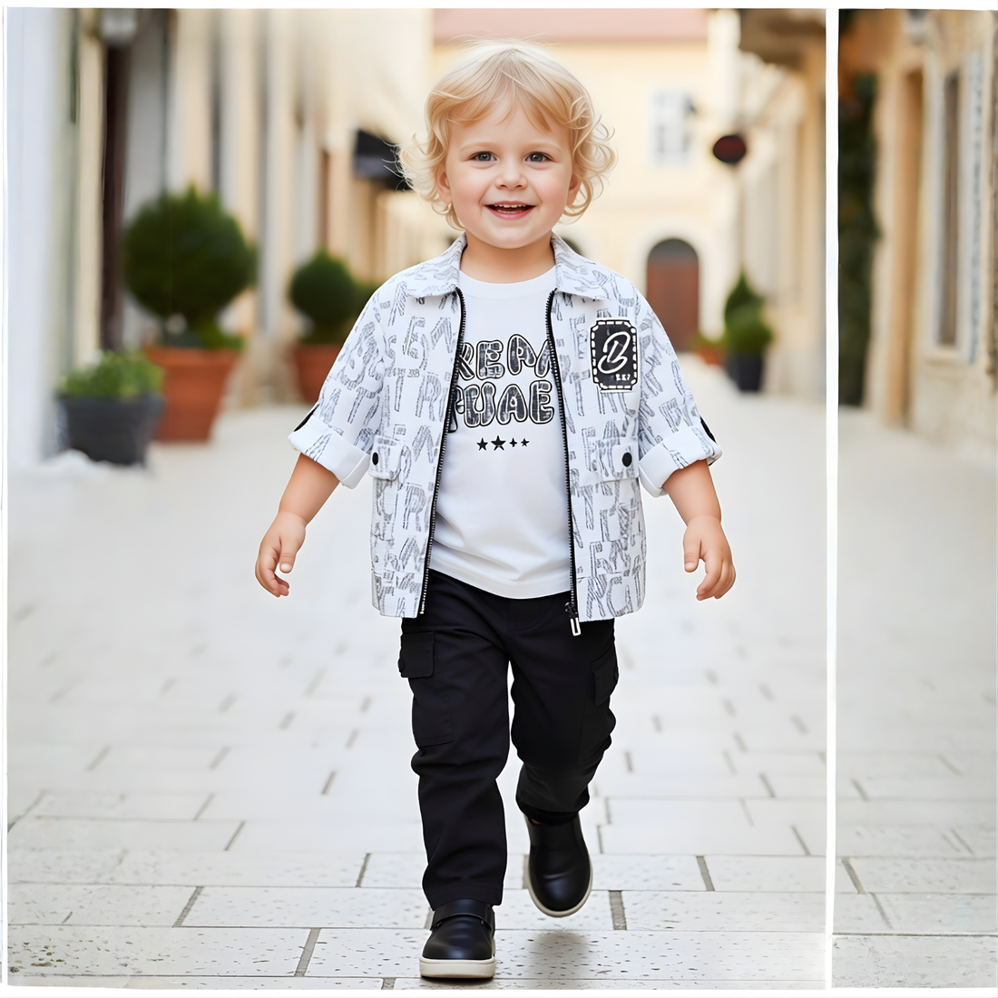 White Kurta Set with Black Printed Jacket Black Pajama For Boys