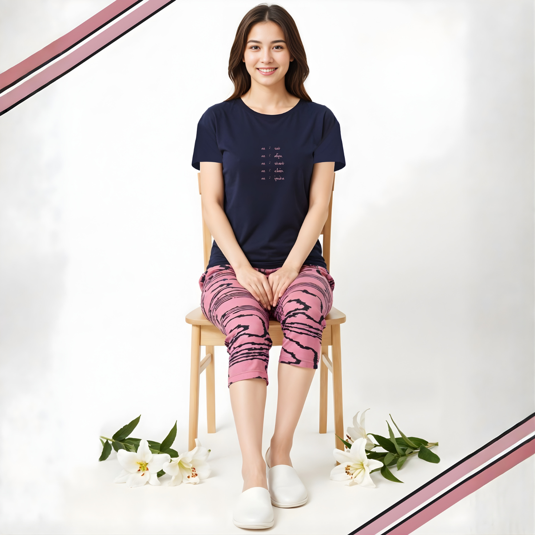 Comfortable blue night suit with round neckline and half sleeves. Perfect for restful sleep and...