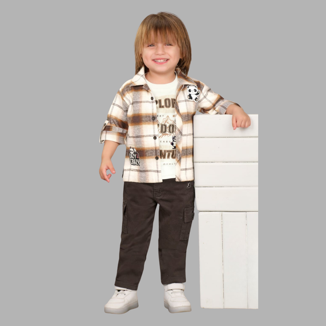 Stylish brown checked shirt paired with matching pants and a crisp white t-shirt. Perfect three-piece...