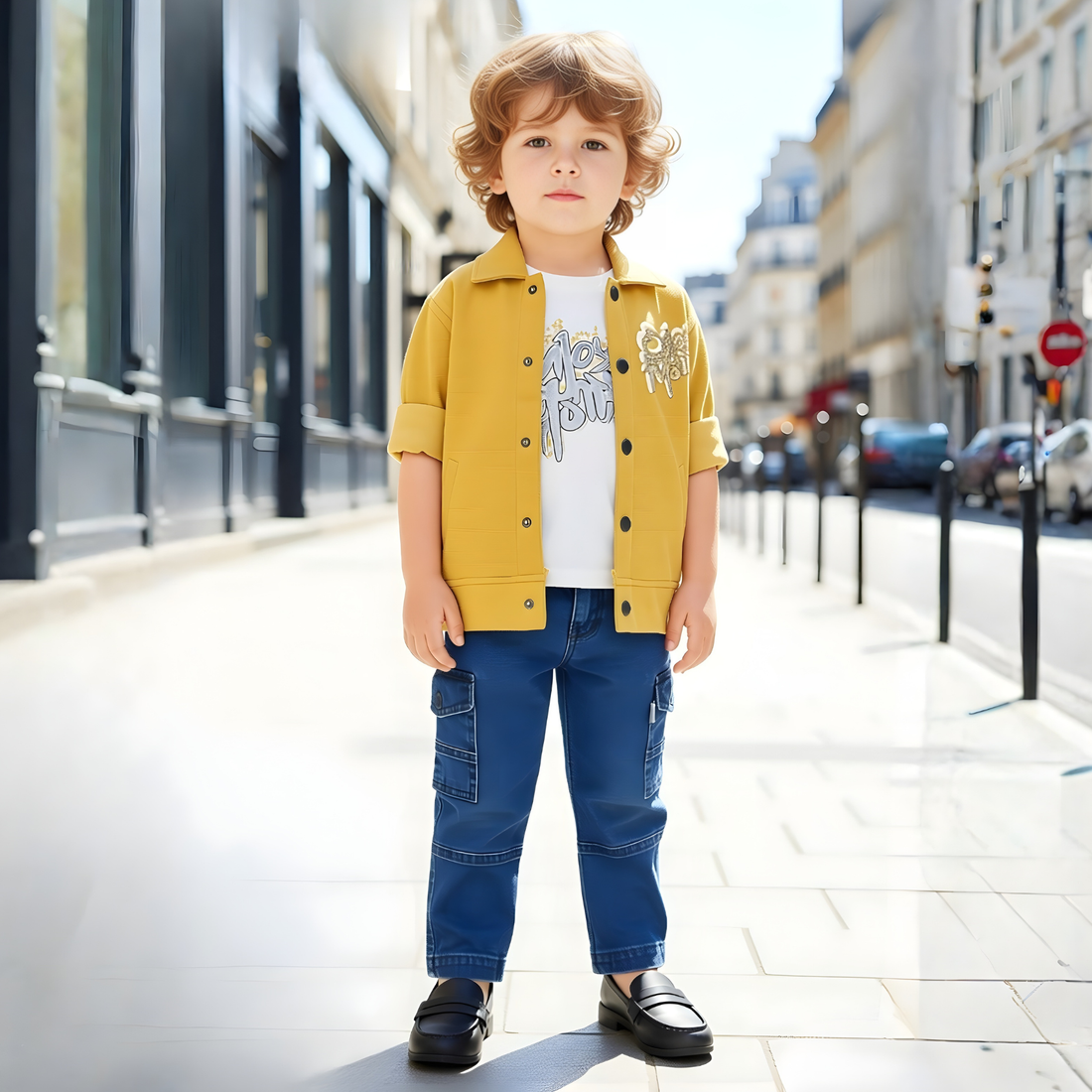 Bright yellow long-sleeve shirt paired with classic denim jeans. Perfect everyday set for active boys...