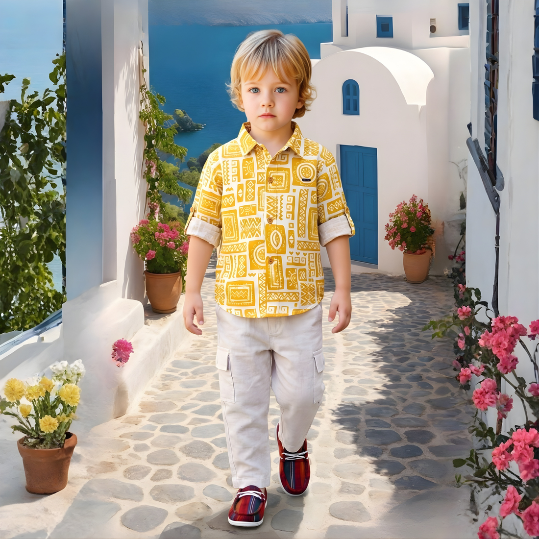 Vibrant yellow printed shirt and pant set designed for boys. Perfect for casual outings and...