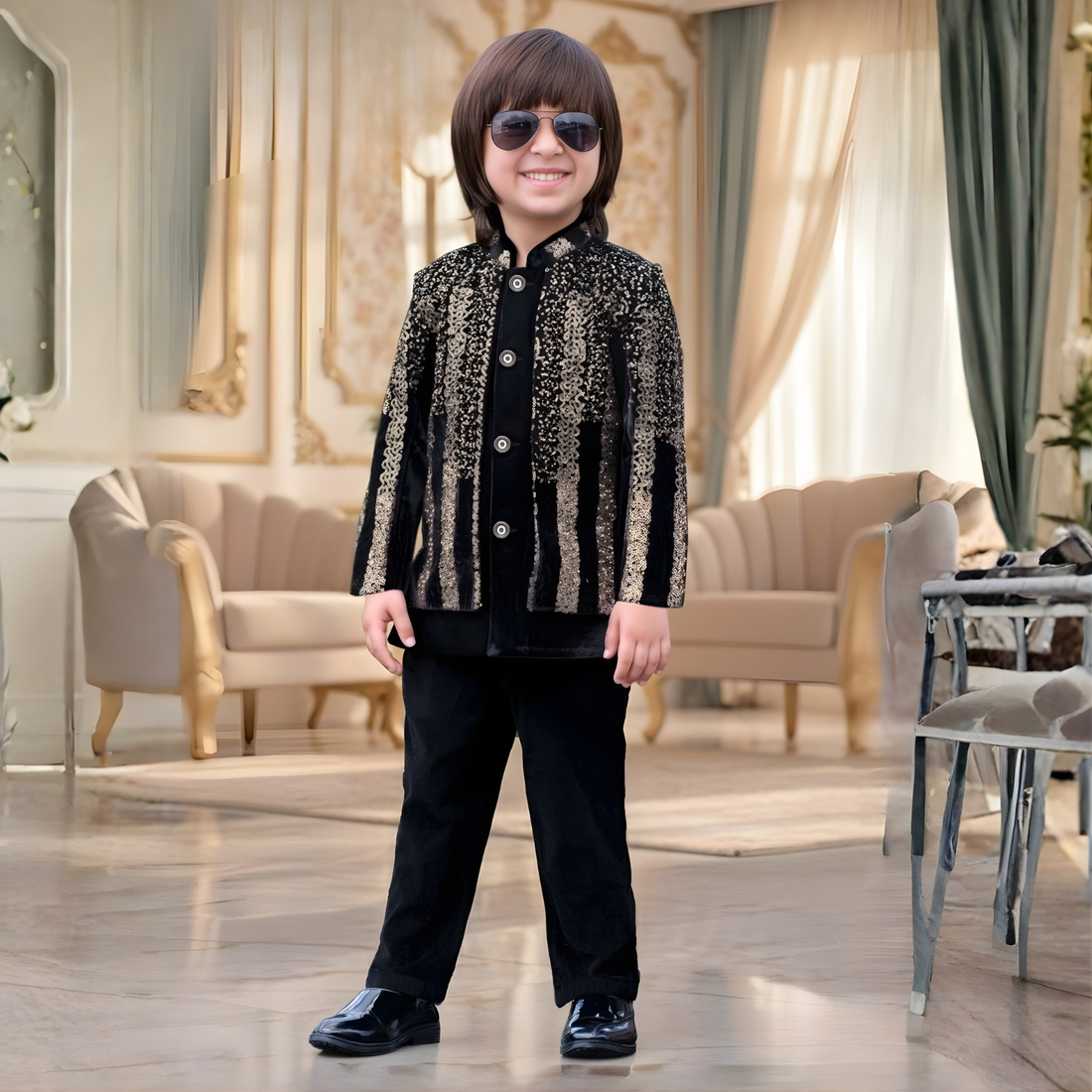 Elegant boys gold jacket set featuring intricate embroidery. Perfect for special occasions, celebrations, and formal...