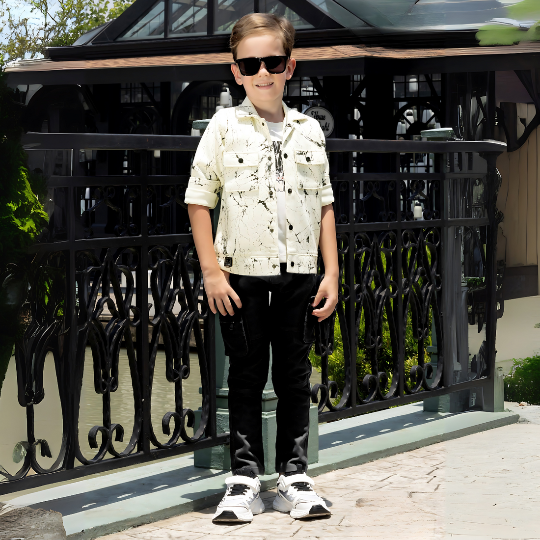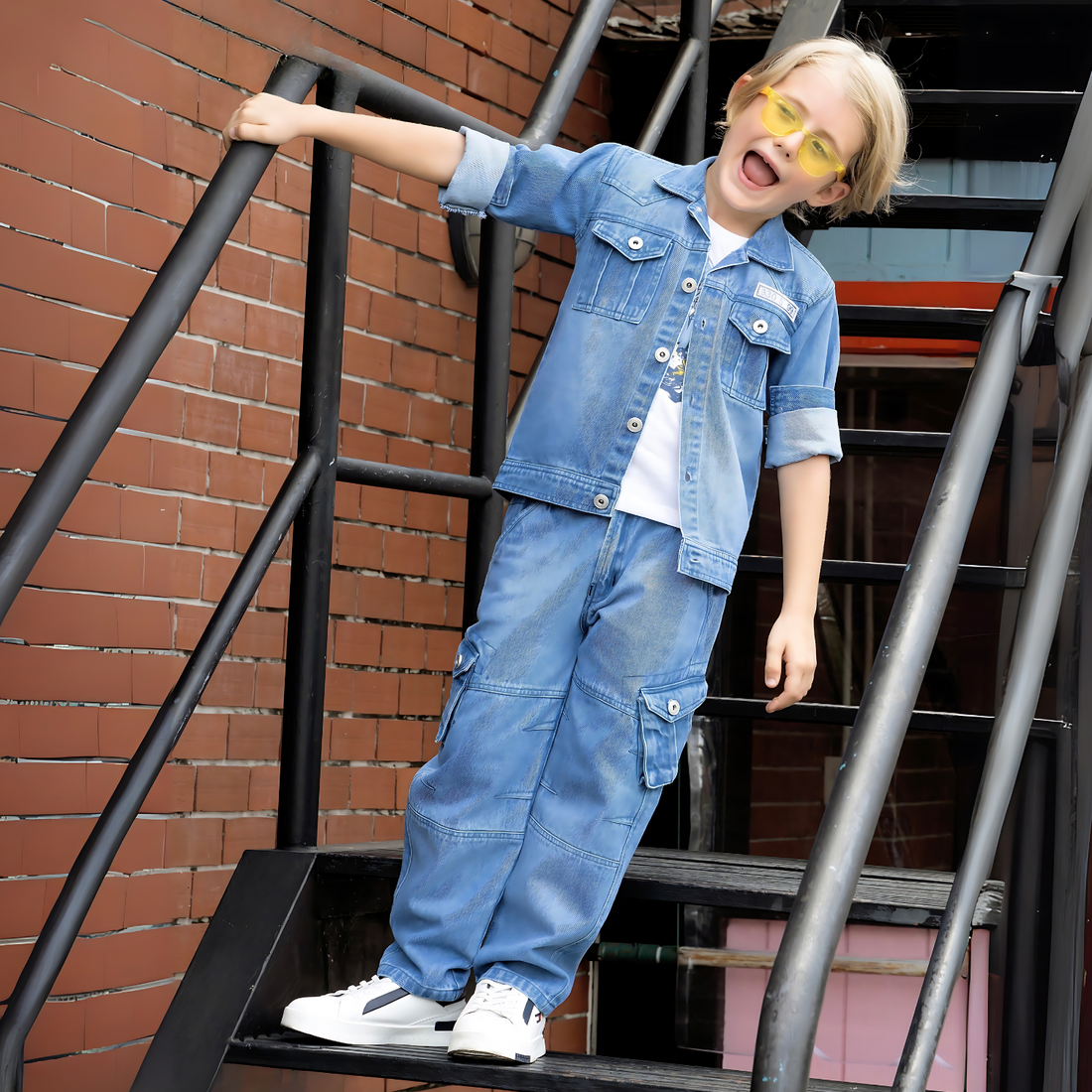 This boys' set features a full-sleeve denim jacket paired with a soft T-shirt and matching...