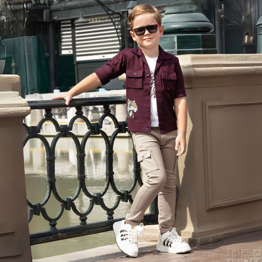 This boys' three-piece set features a maroon jacket, a crisp white T-shirt, and fawn-colored pants,...