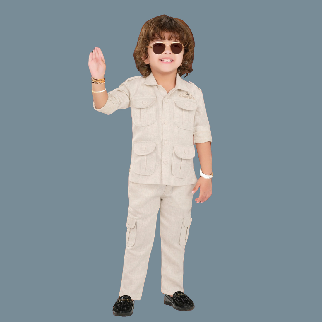 Elevate your young gentleman's style with this Boys Cream Party Coat Suit, tailored for comfort...