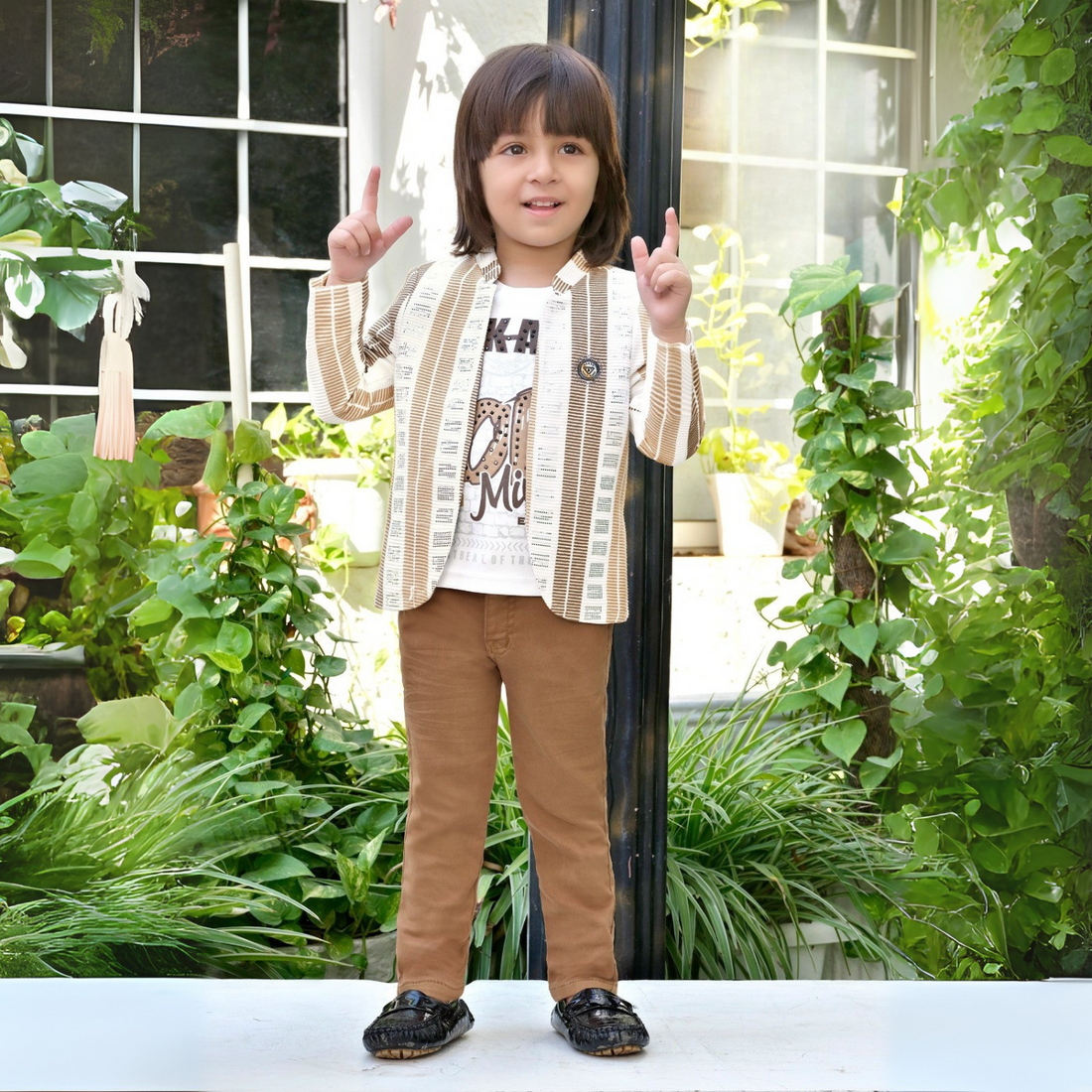 Cream With Fawn Printed Blazer, T-Shirt And Brown Pant Set