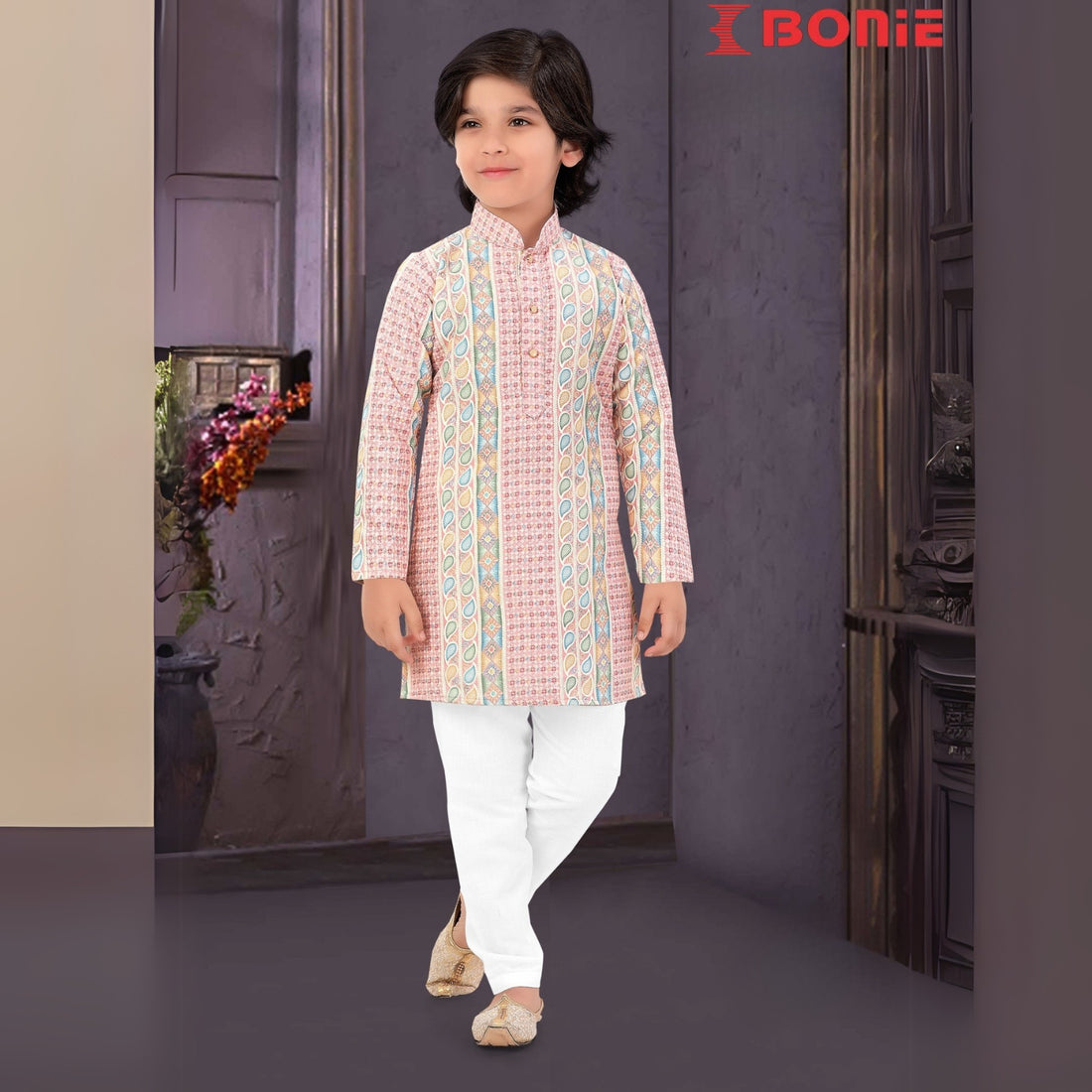 For his charming appeal buy this pink printed kurta suit. It is made from smooth...