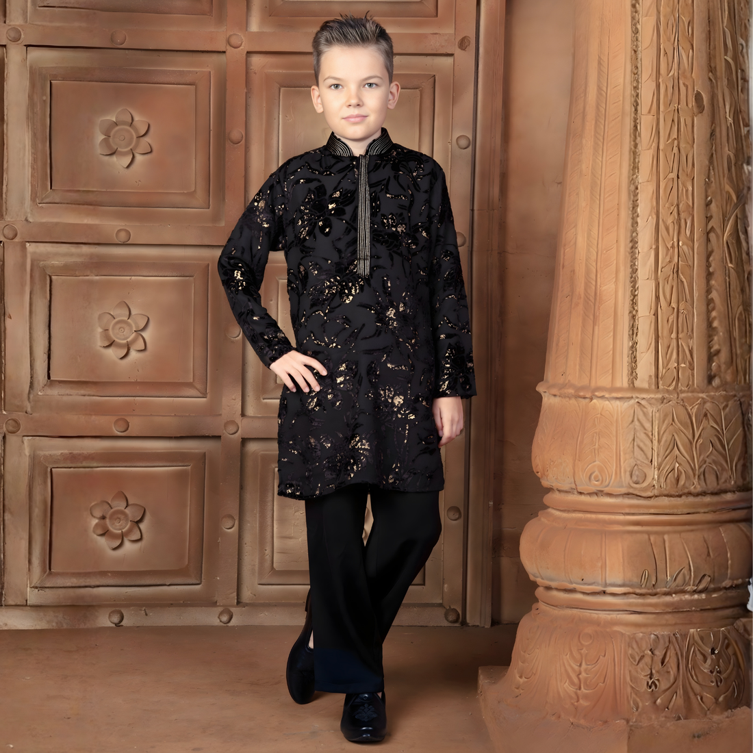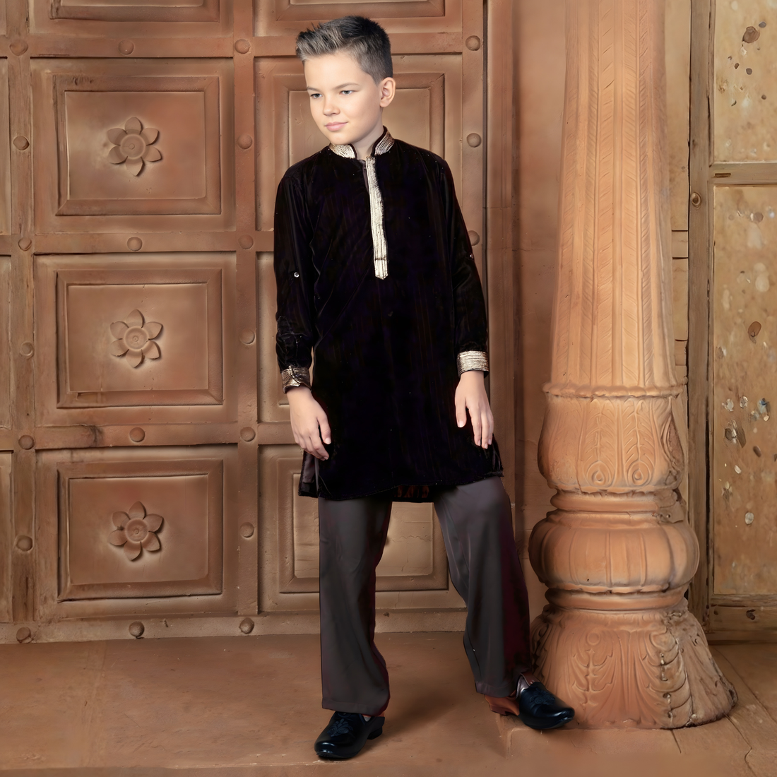 This black velvet kurta and pyjama set combines traditional elegance with contemporary styling, designed specifically...