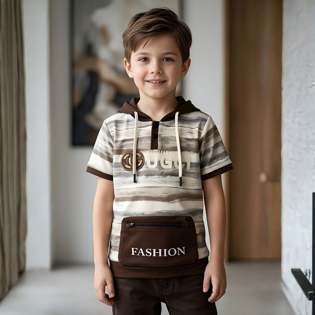 Stylish brown printed hooded half-sleeve t-shirt for boys. Comfortable casual wear perfect for everyday adventures...