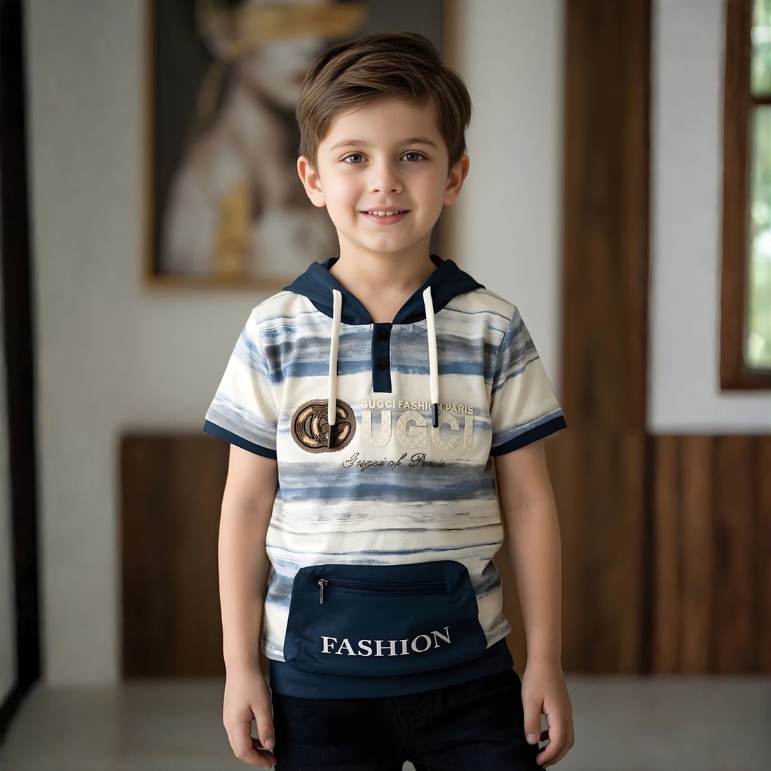 Stylish Blue printed hooded half-sleeve t-shirt for boys. Comfortable casual wear perfect for everyday adventures...