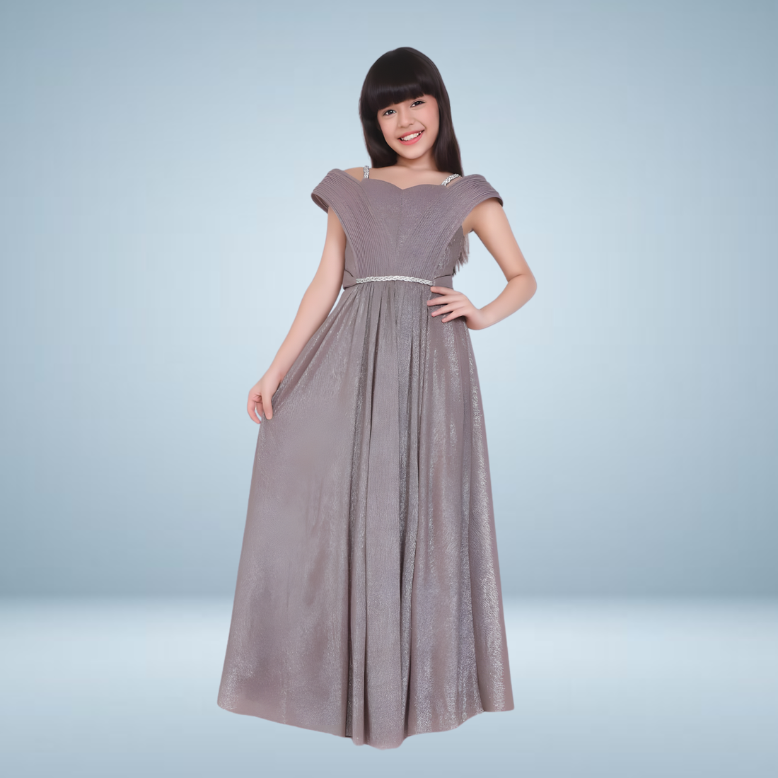Elegant Purple shimmer gown designed for girls' special occasions. Features sparkling embellishments and comfortable fit...