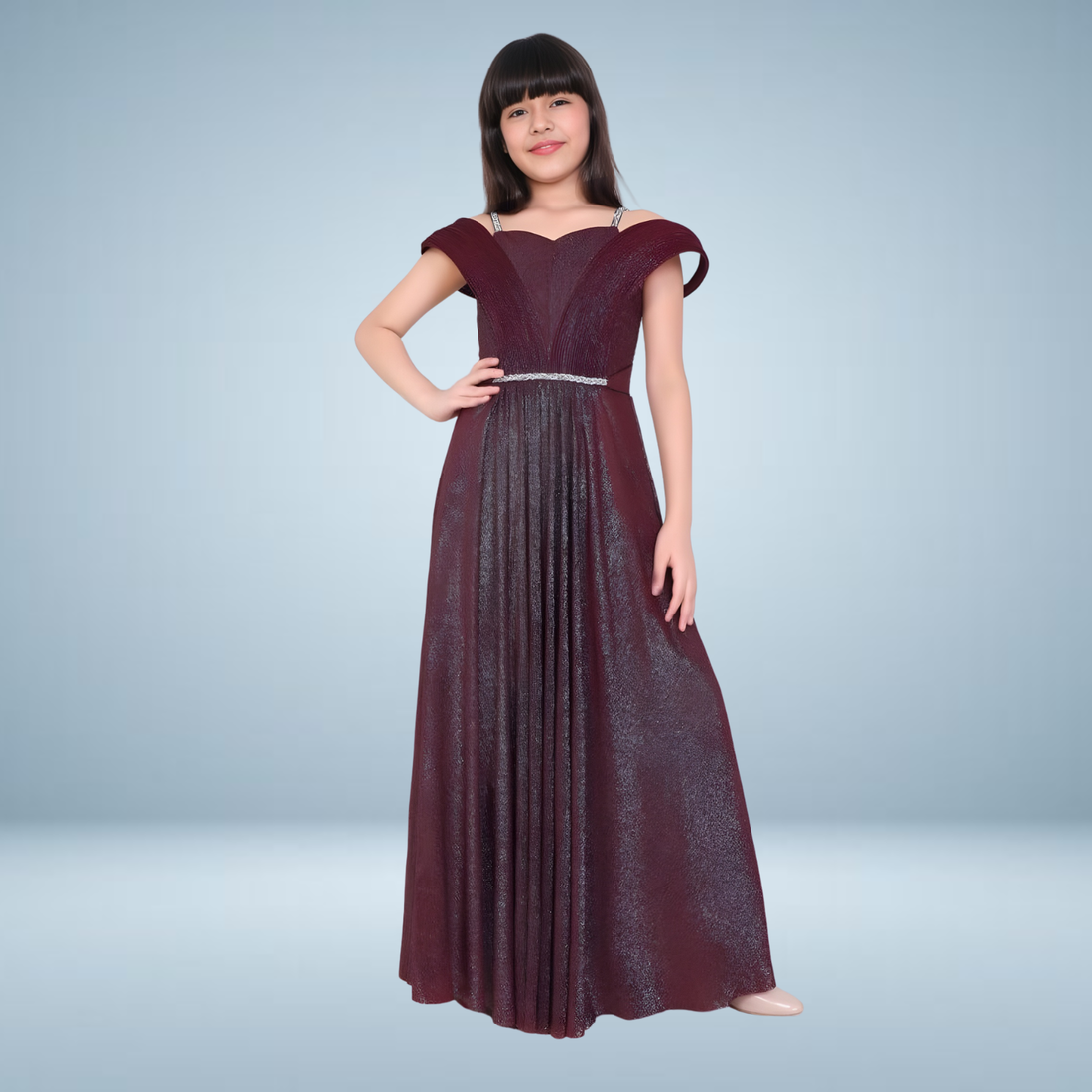 Elegant purple shimmer gown designed for girls' special occasions. Features shimmering fabric and sophisticated styling...