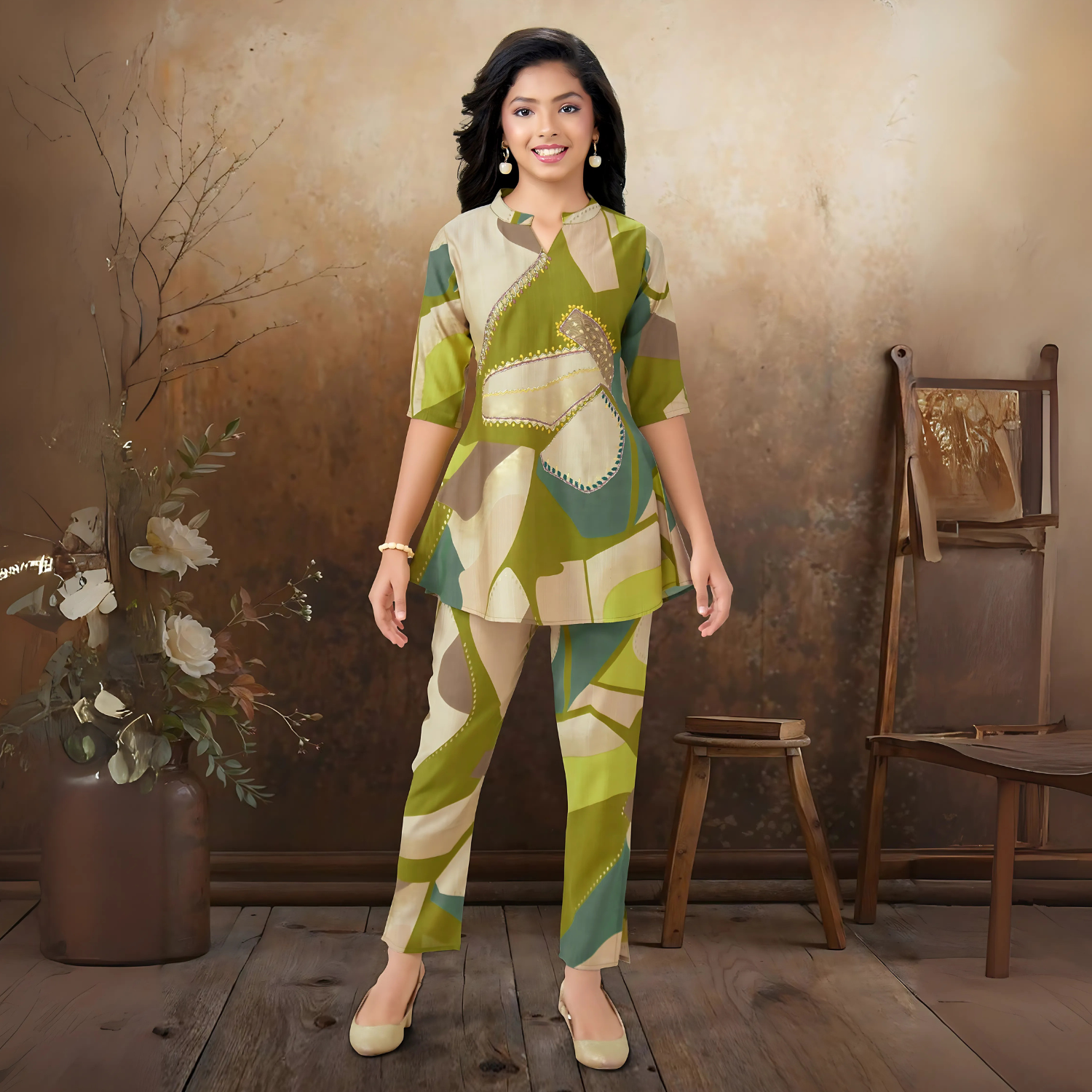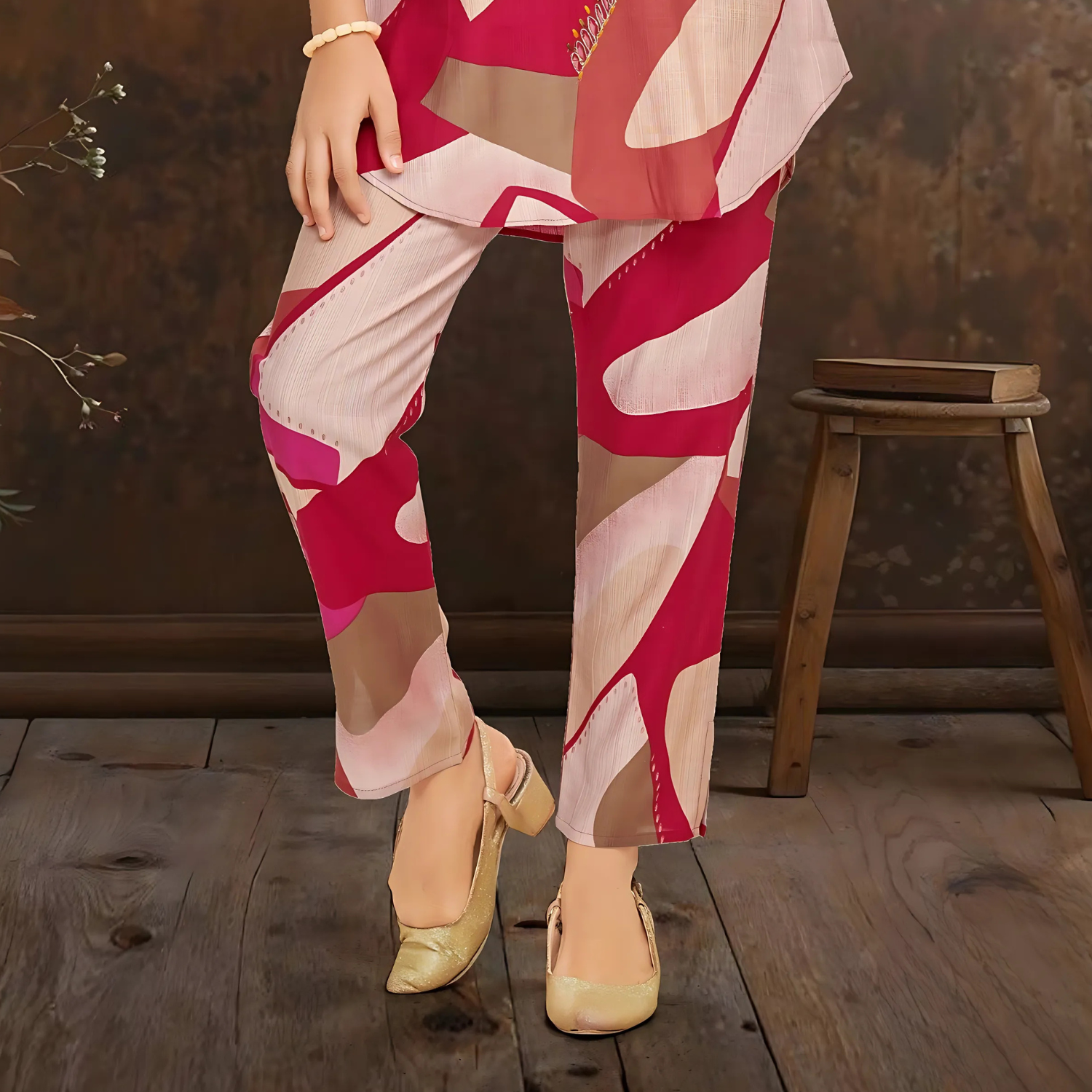 This beautifully printed cord set for girls offers both style and comfort. Crafted from soft, durable fabric, it ensures all-day wearability while the vibrant prints add a playful yet elegant touch to any outfit. Perfect for casual outings or relaxed indoor wear,