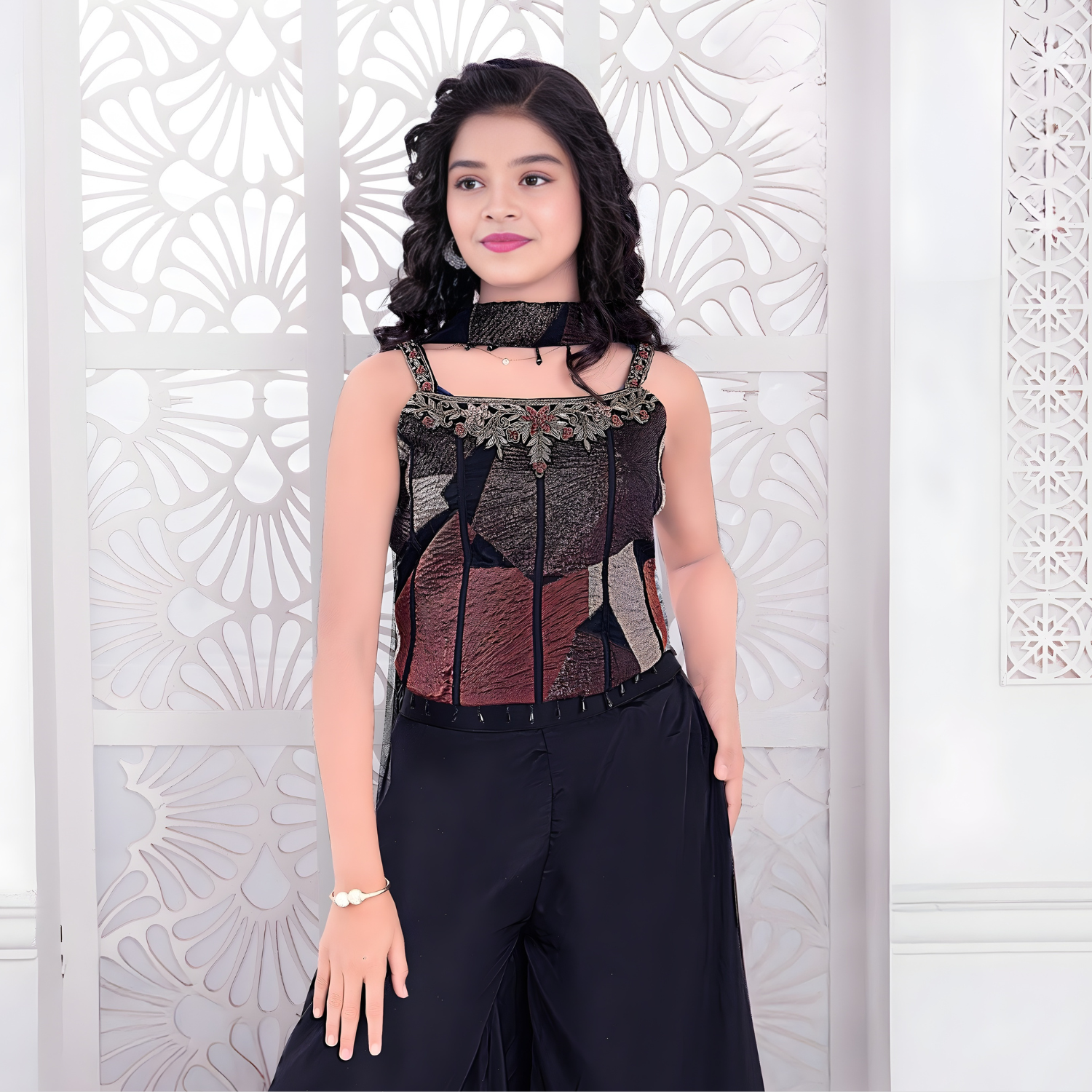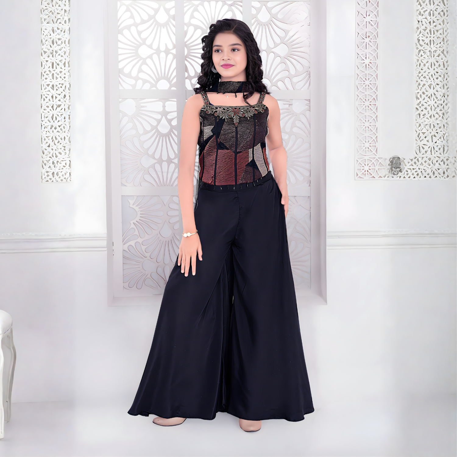 Elegant black palazzo suit perfect for parties. Comfortable, stylish silhouette with sophisticated appeal for special occasions,