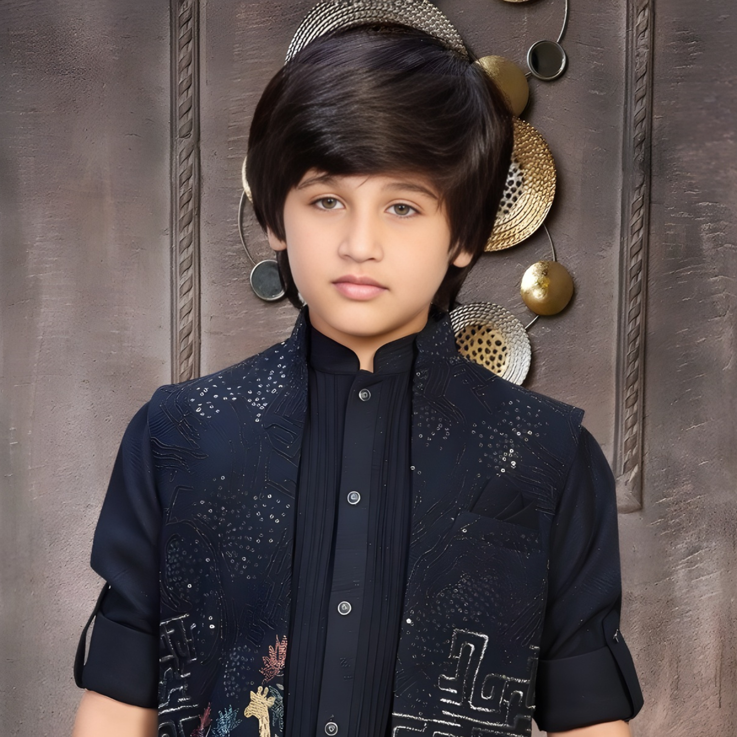 Elegant black embroidered kurta set featuring a matching waistcoat. Perfect for festive occasions and celebrations with sophisticated traditional styling.