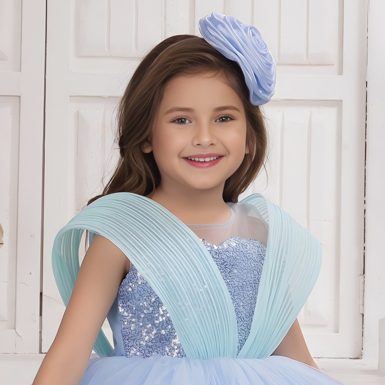 Elegant blue party frock featuring delicate ruffles and shimmering sequin embellishments. Perfect for celebrations and special occasions.