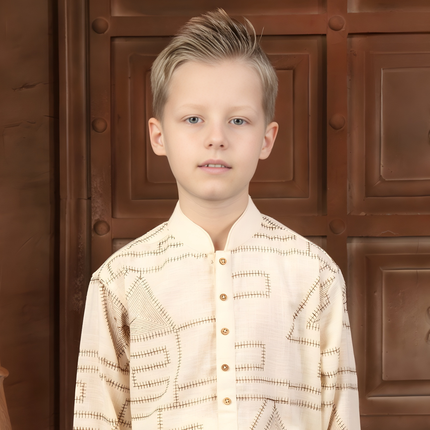 This Fawn kurta and pyjama set combines traditional elegance with contemporary styling, designed specifically for boys' festive and formal occasions.
