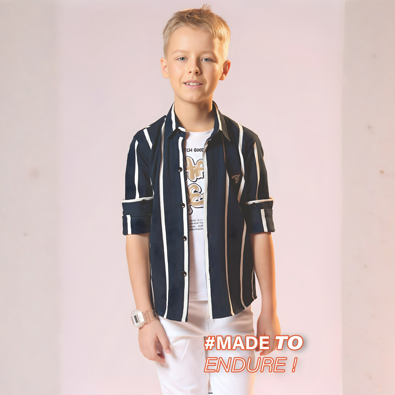Boys Blue Slim Fit Stripe Full Sleeves Shirt Crafted for the modern young man, this blue striped shirt combines contemporary style with practical comfort. The slim fit silhouette creates a polished appearance while allowing unrestricted movement, making it ideal for both casual outings and semi-formal occasions.