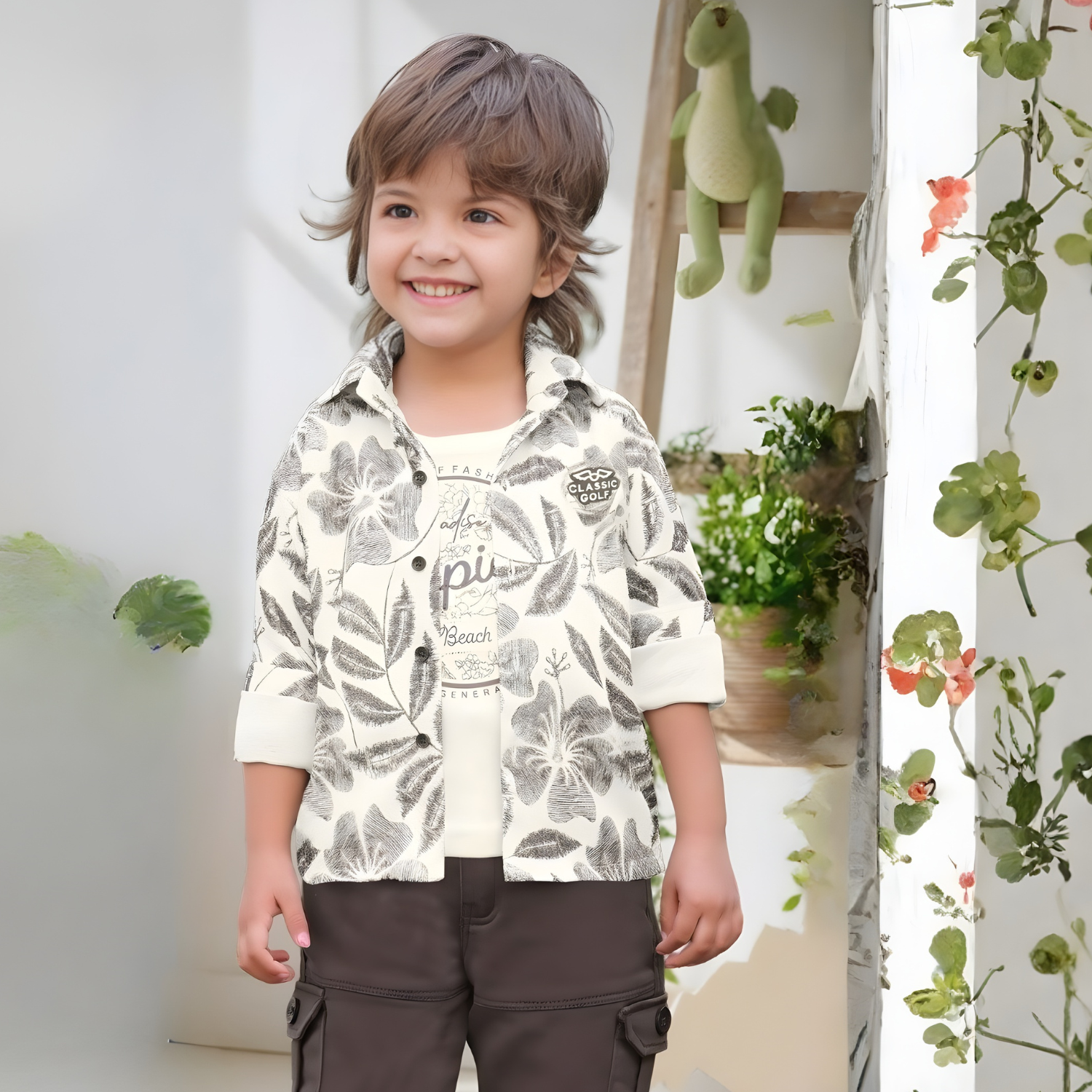 Boys Fawn Pant Set with White Printed Jacket And T-Shirt