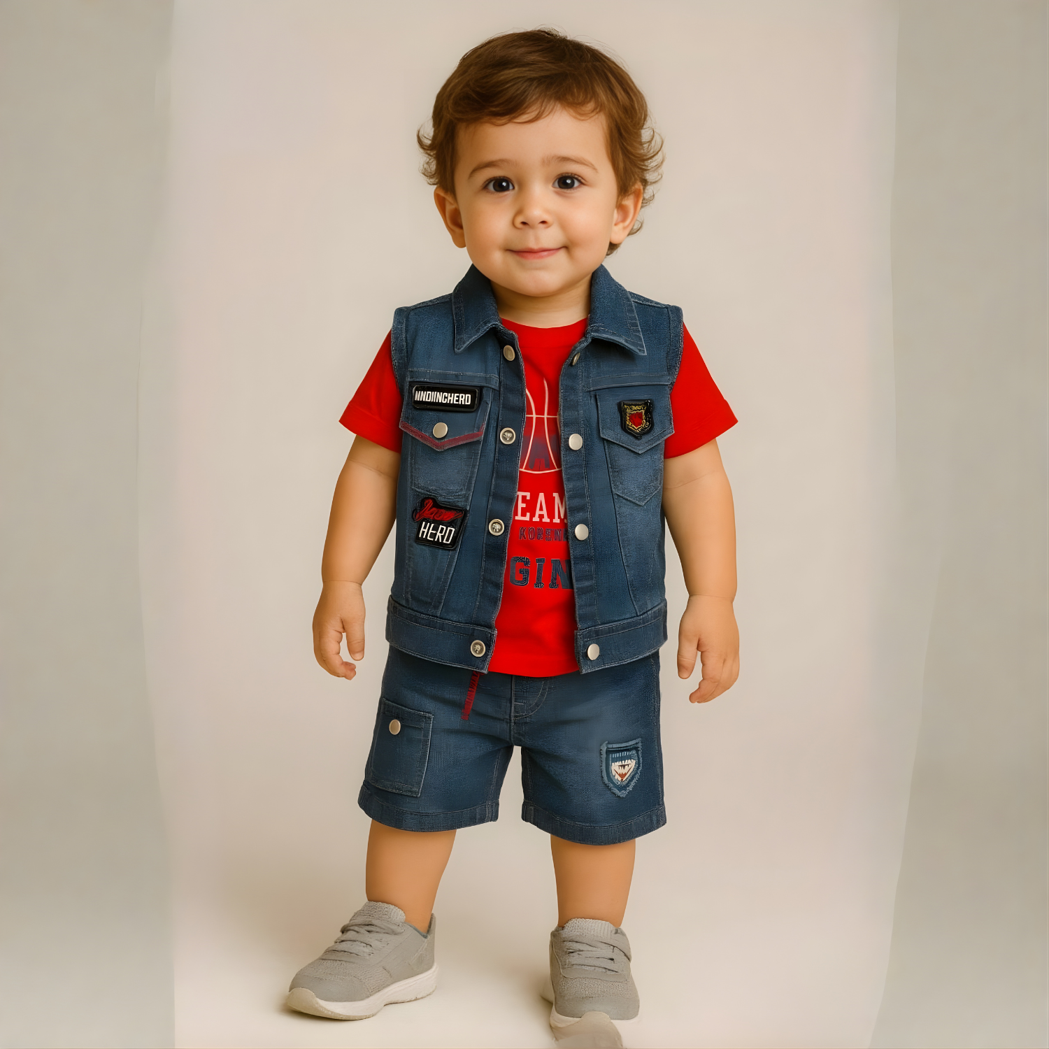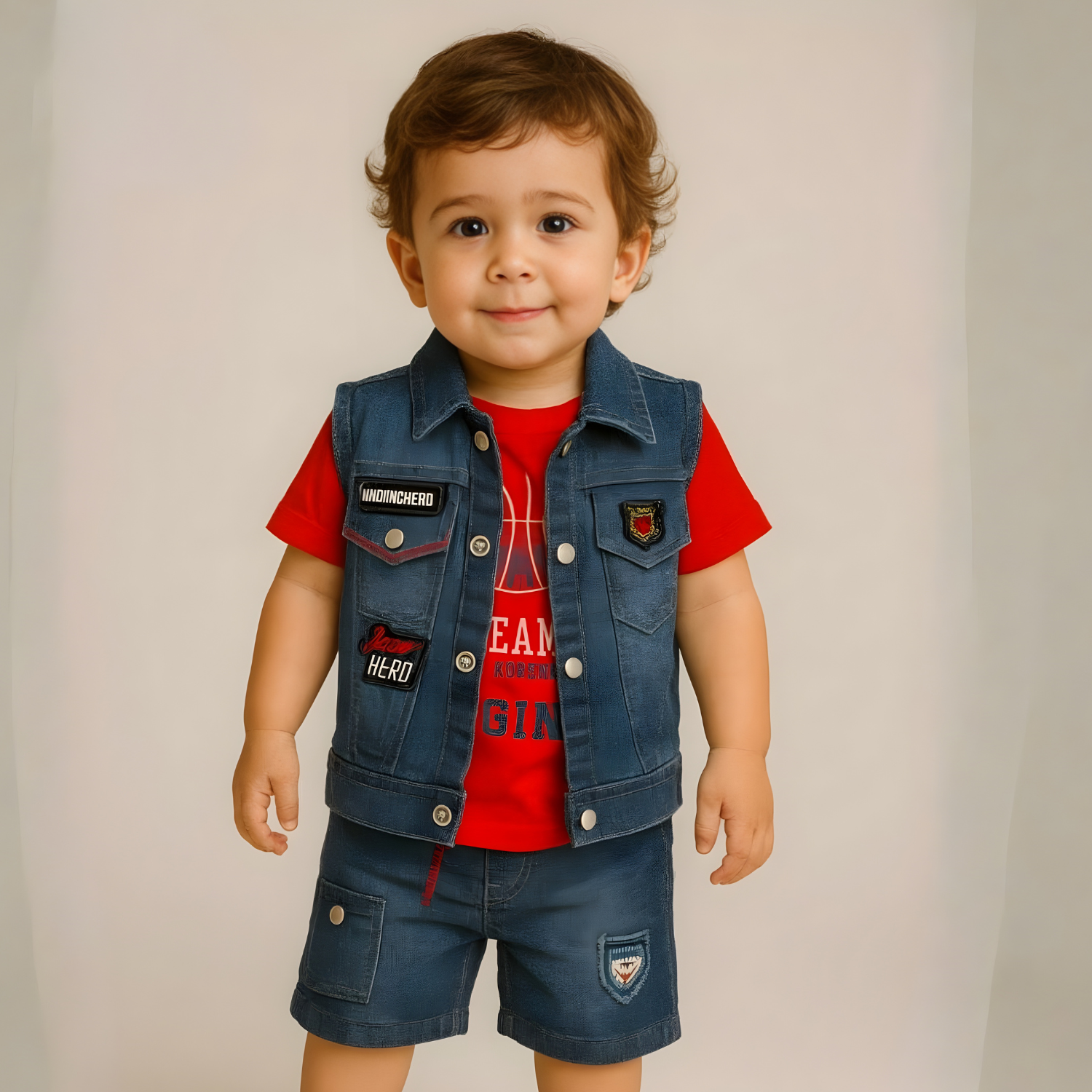 Stylish boys' set featuring a classic denim jacket paired with a vibrant red tee and shorts. Perfect for casual everyday wear.