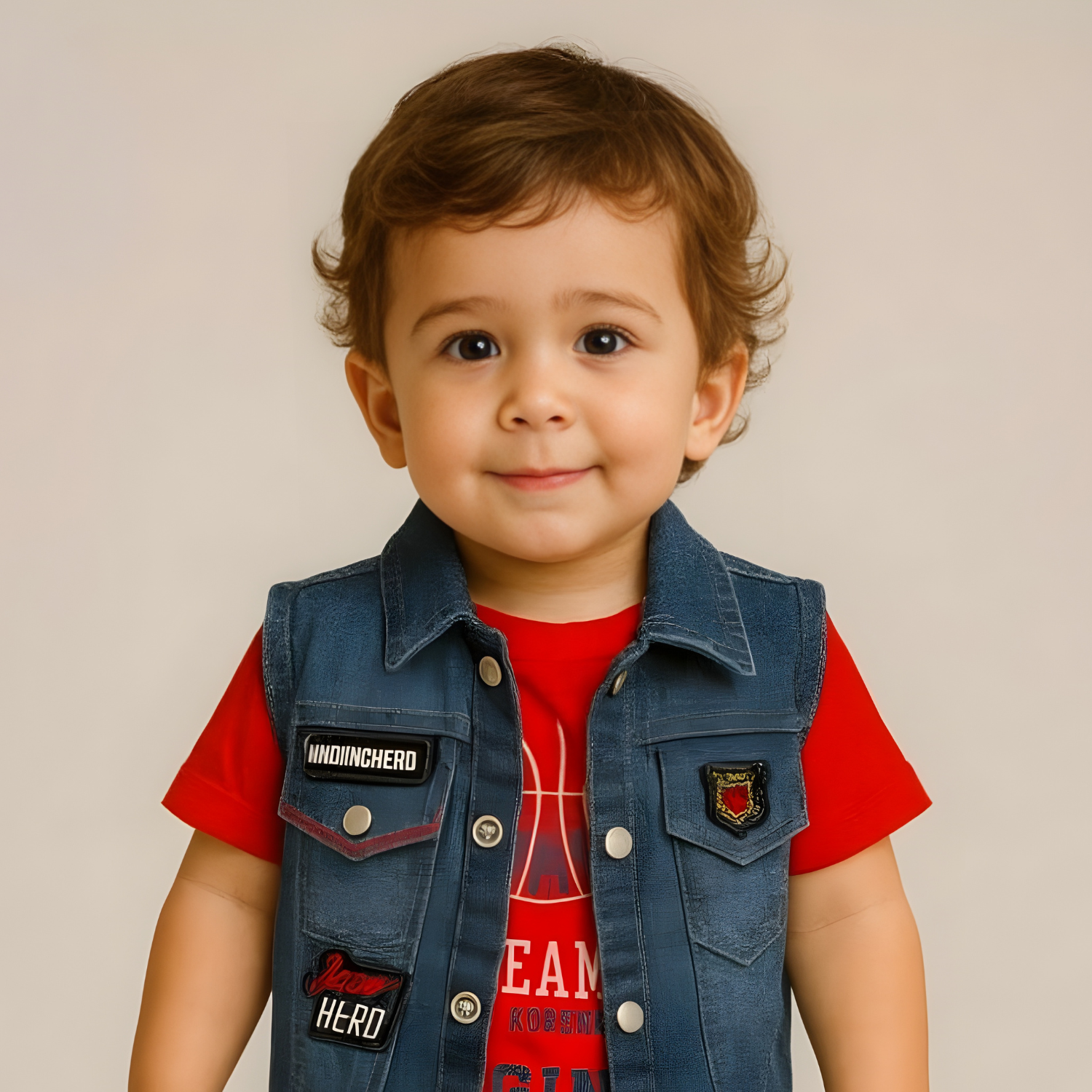 Stylish boys' set featuring a classic denim jacket paired with a vibrant red tee and...