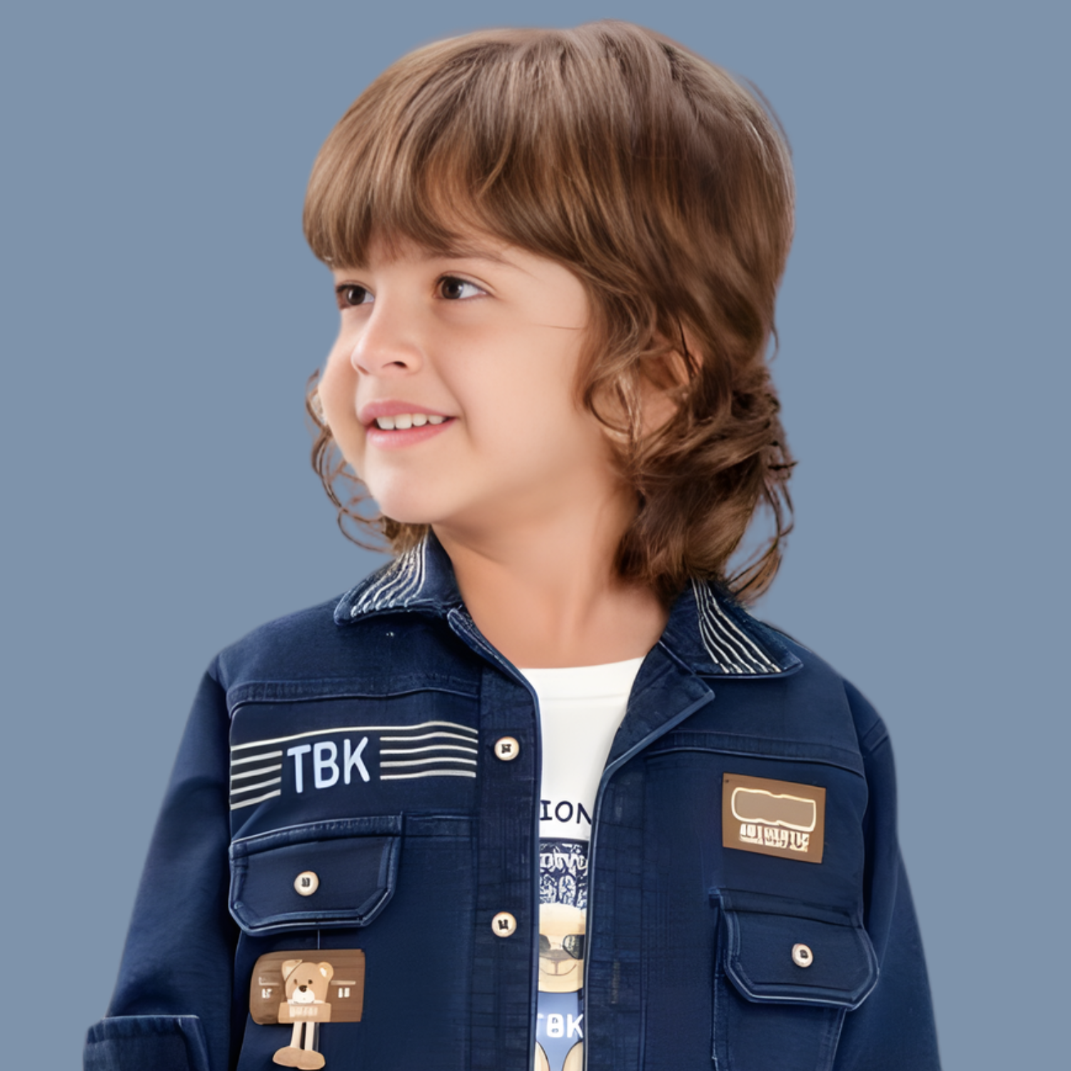 Trendy denim cargo suit featuring matching jacket. Perfect for stylish boys seeking contemporary fashion with practical cargo pockets and durable construction.