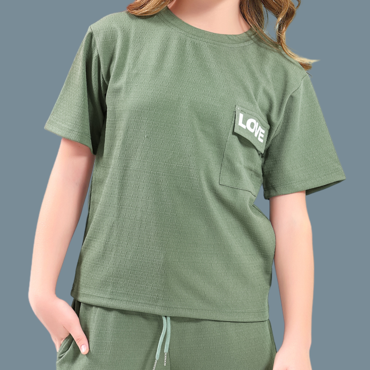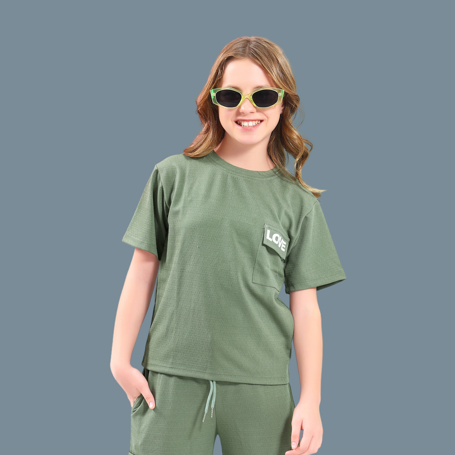 This green Girls Night Suit offers comfortable, breathable fabric ideal for restful sleep. Its soft texture and relaxed fit ensure ease of movement, making it perfect for nighttime wear.
