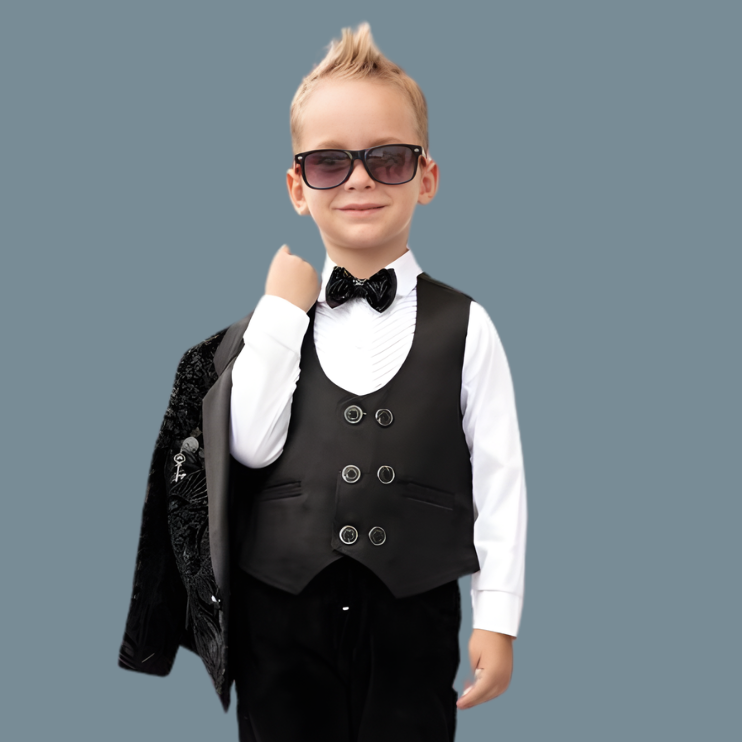 Sophisticated black coat suit for boys. Perfect for parties, weddings, and formal occasions. Premium tailoring ensures comfort and style.