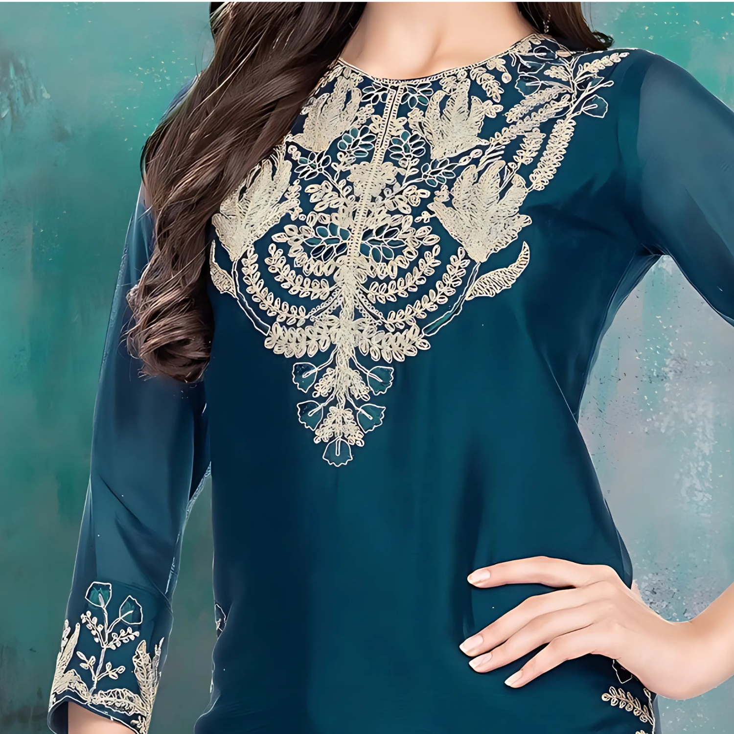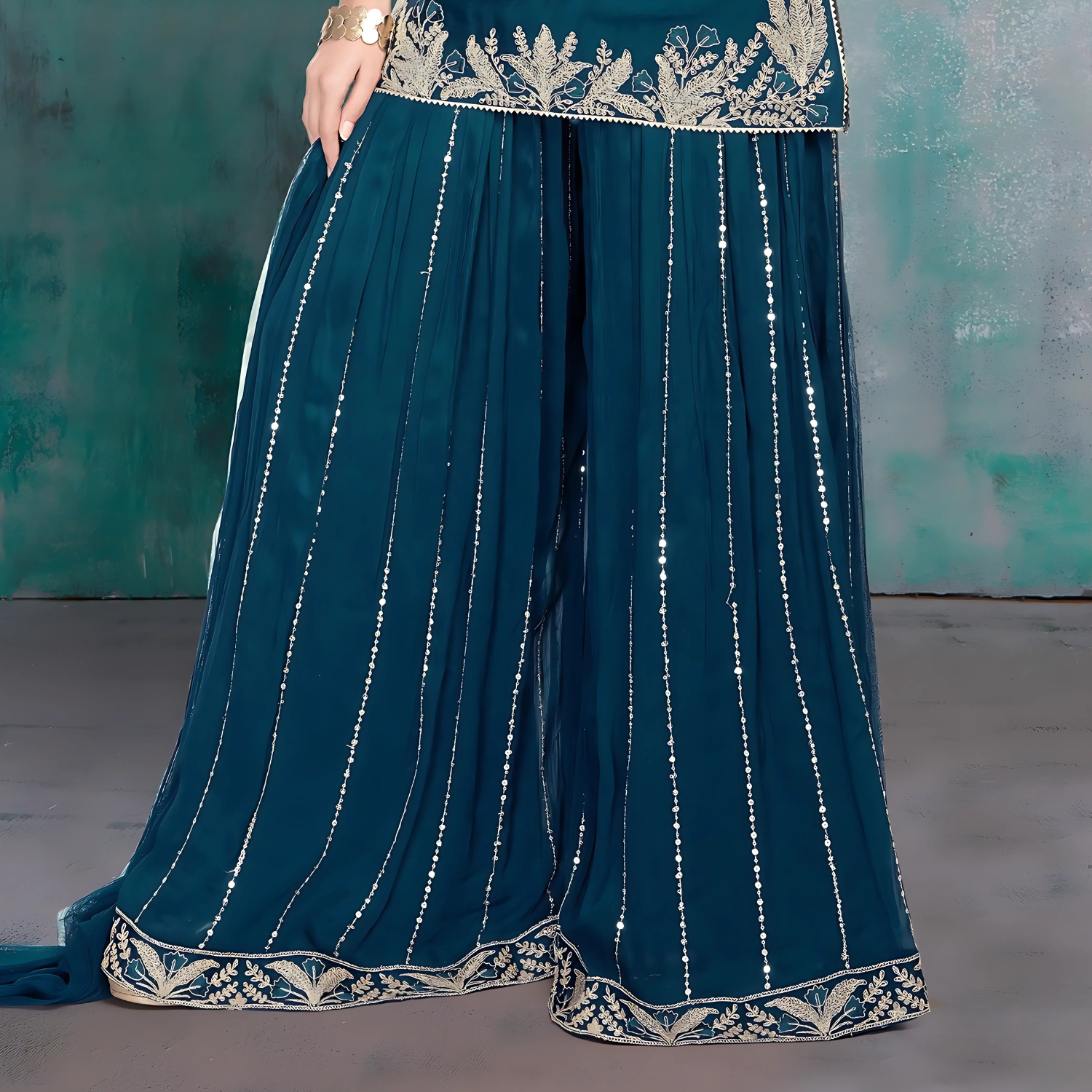 This elegant blue georgette palazzo suit offers a perfect blend of comfort and style, featuring a flowing fabric that drapes beautifully. The lightweight georgette material paired with a matching dupatta.