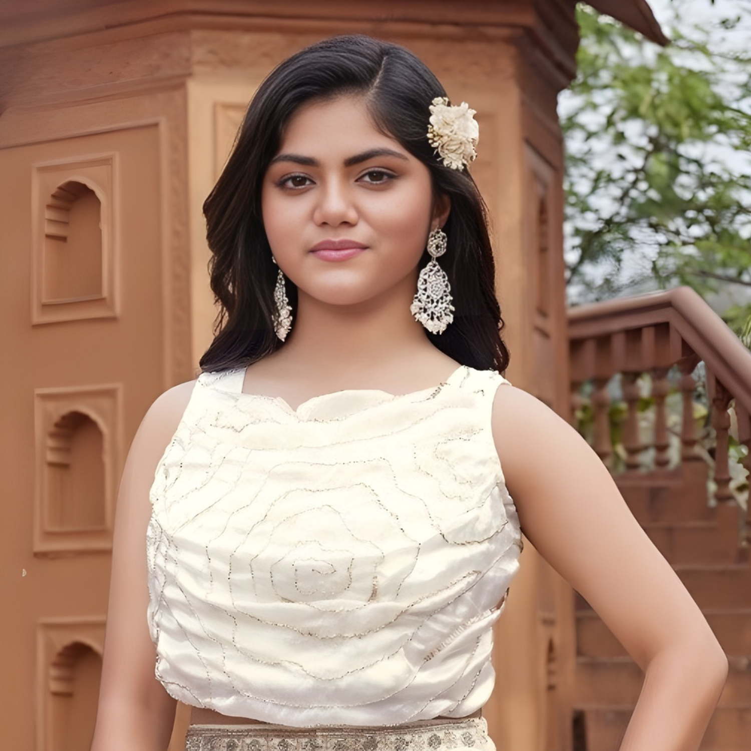 Elegant cream organza lehenga choli featuring intricate embroidery and flattering fishcut silhouette. Perfect for weddings and festive celebrations.
