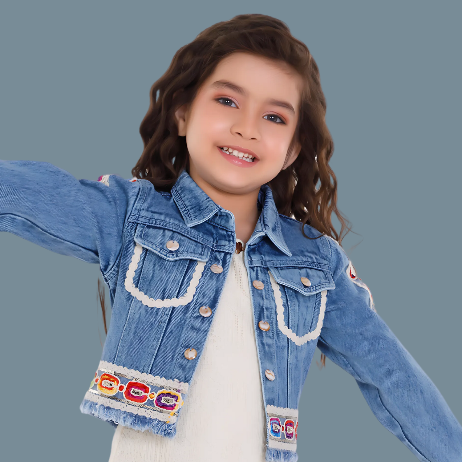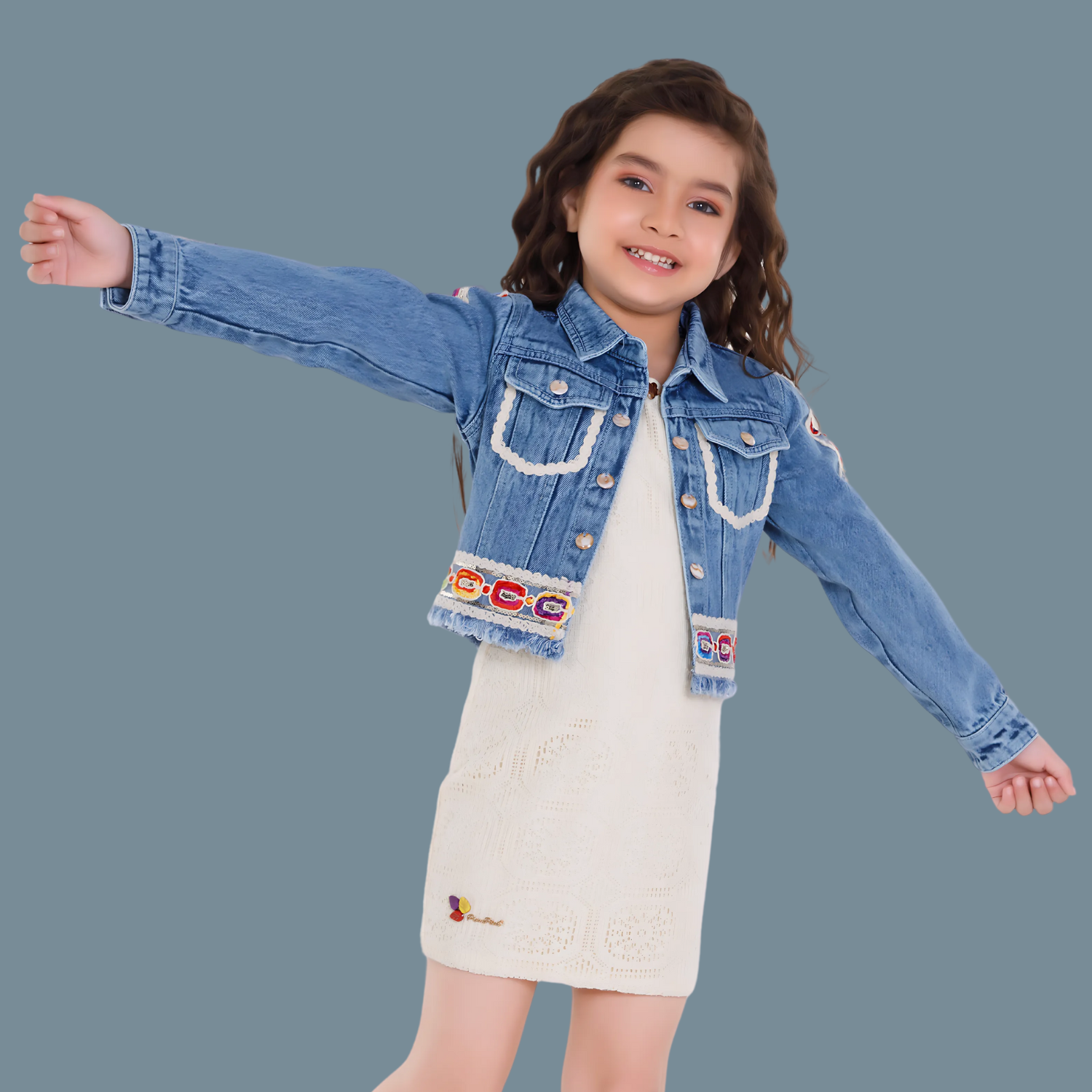 This cream frock paired with a denim jacket offers a stylish and versatile outfit for girls, combining comfort with a trendy layered look. Perfect for casual outings, it balances softness with the durable edge of denim.