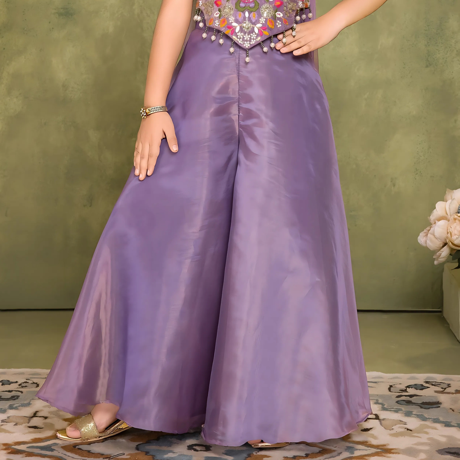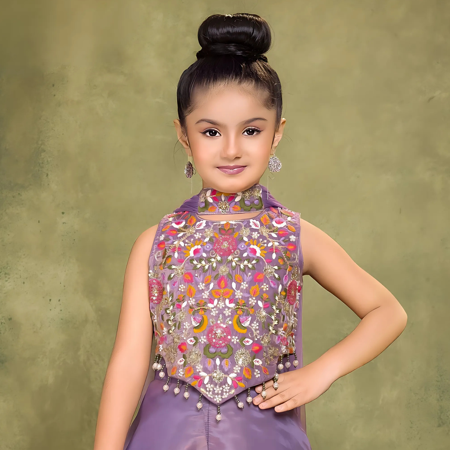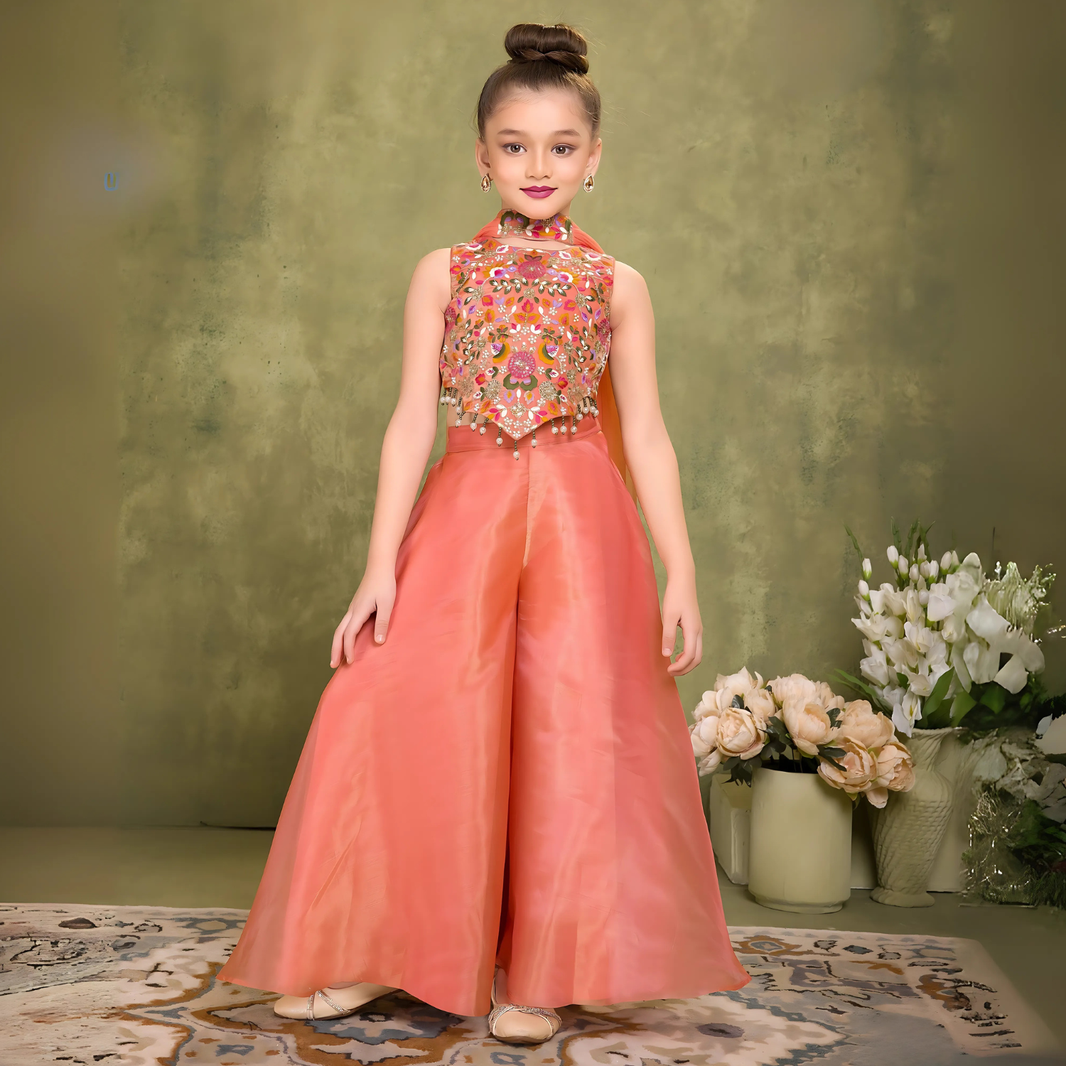 this Palazzo set featuring intricate designer thread embroidery. Crafted for comfort and style, the detailed embroidery enhances the fabric’s texture, offering a refined look perfect for festive and casual occasions. This set combines elegance with ease, ensuring your child feels both chic and comfortable throughout the day.