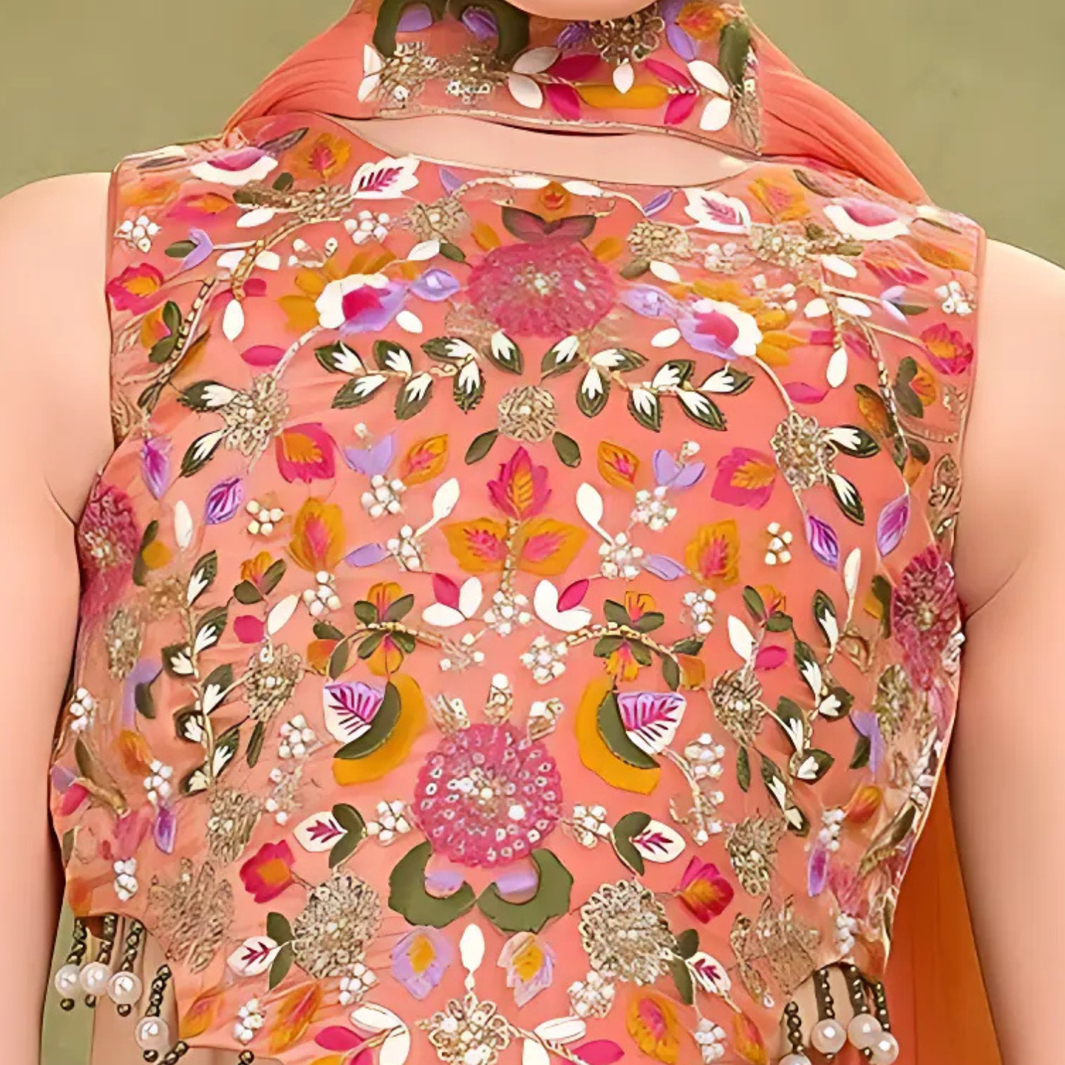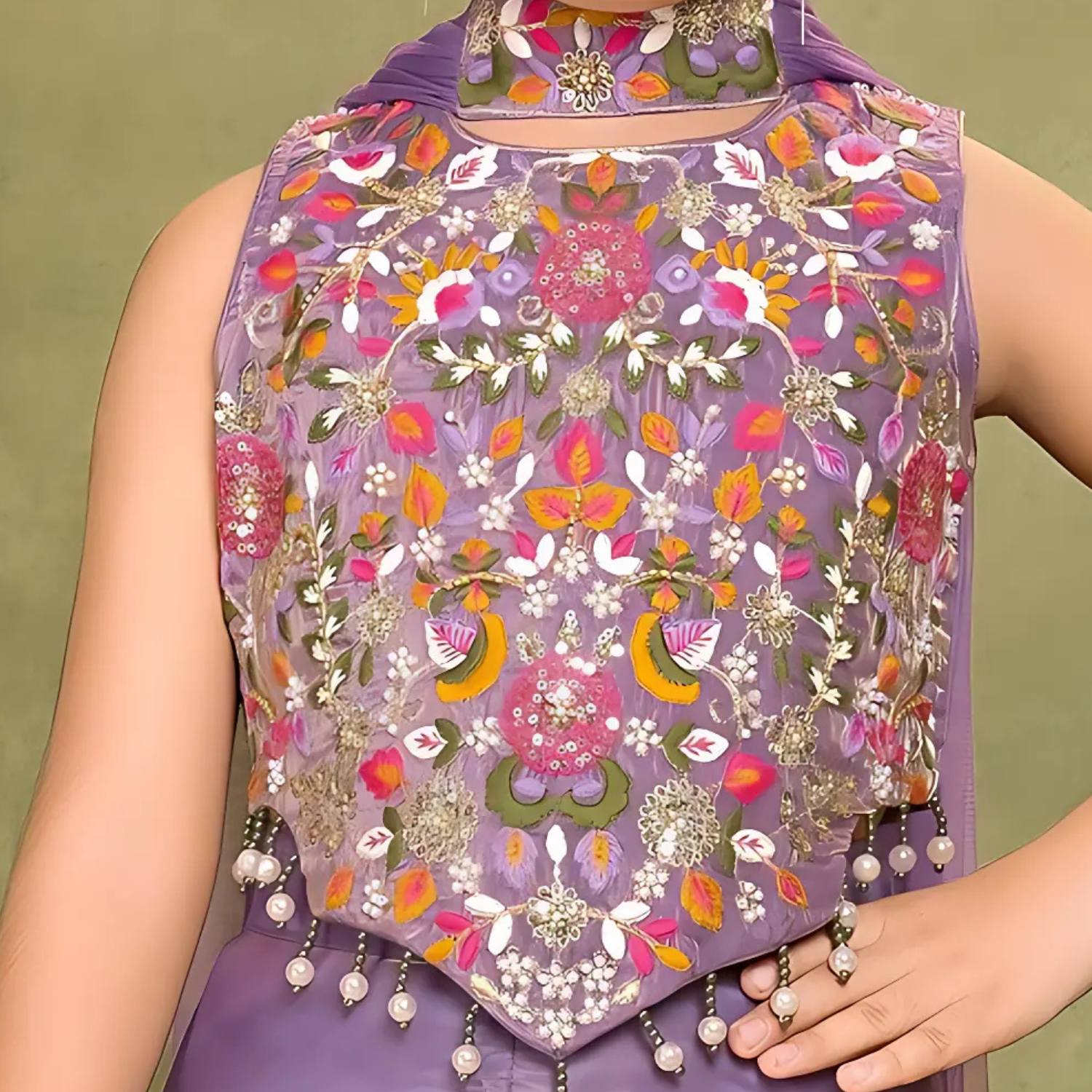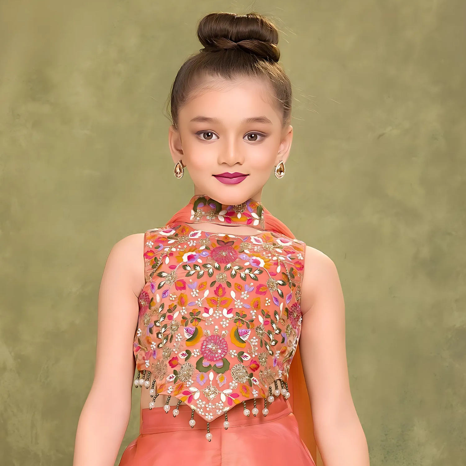 this Palazzo set featuring intricate designer thread embroidery. Crafted for comfort and style, the detailed embroidery enhances the fabric’s texture, offering a refined look perfect for festive and casual occasions. This set combines elegance with ease, ensuring your child feels both chic and comfortable throughout the day.