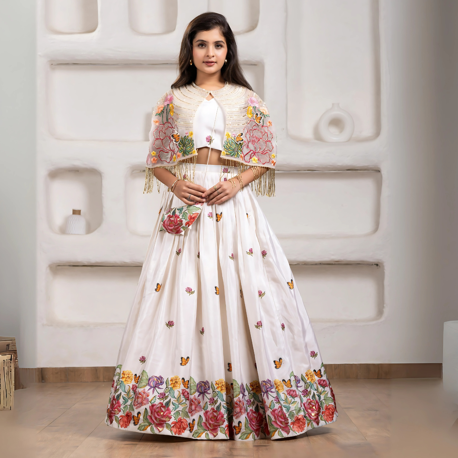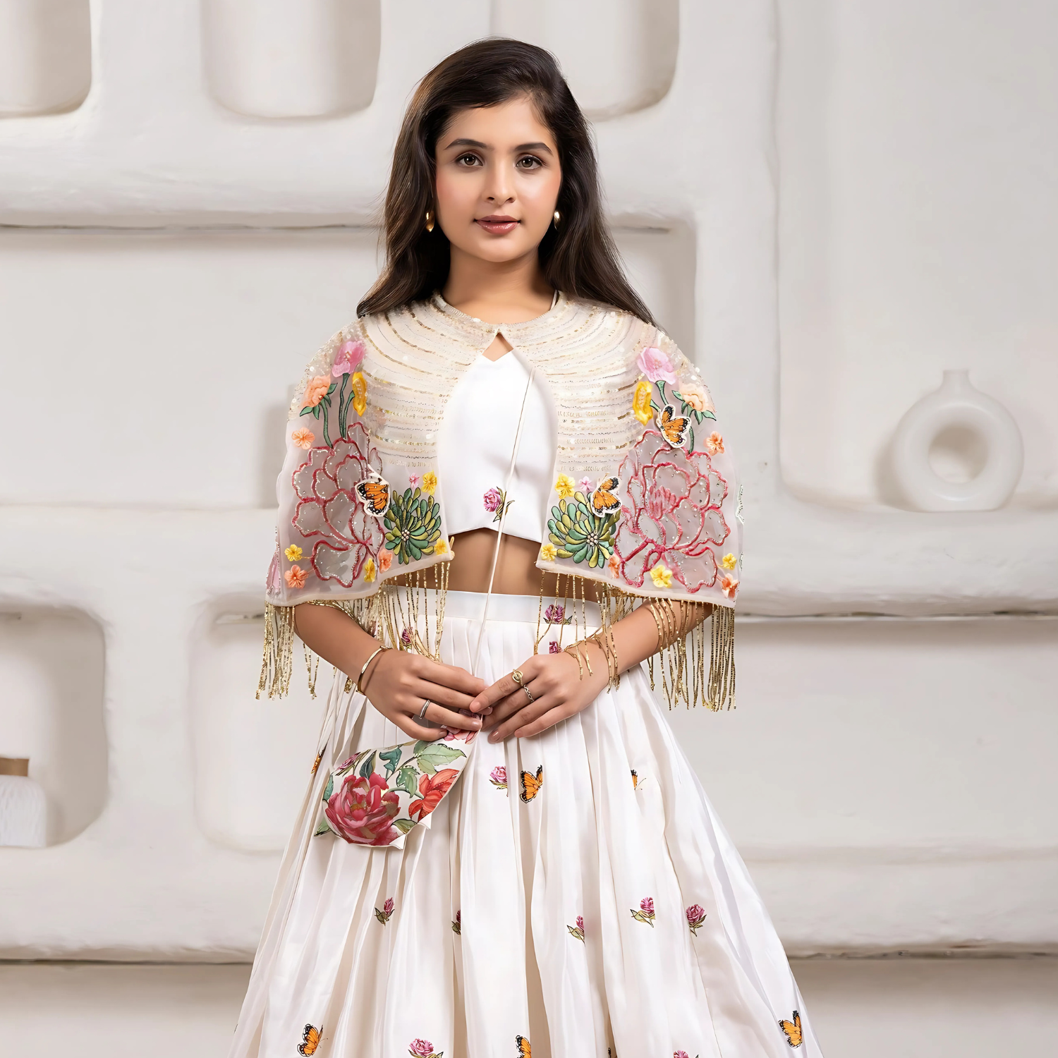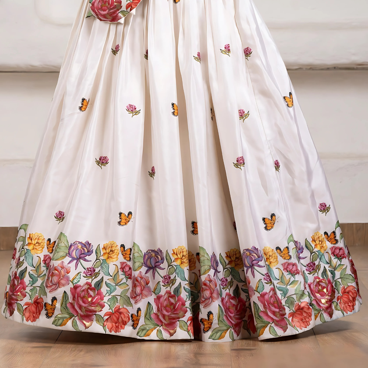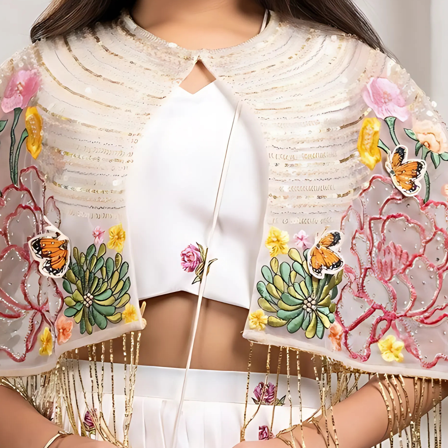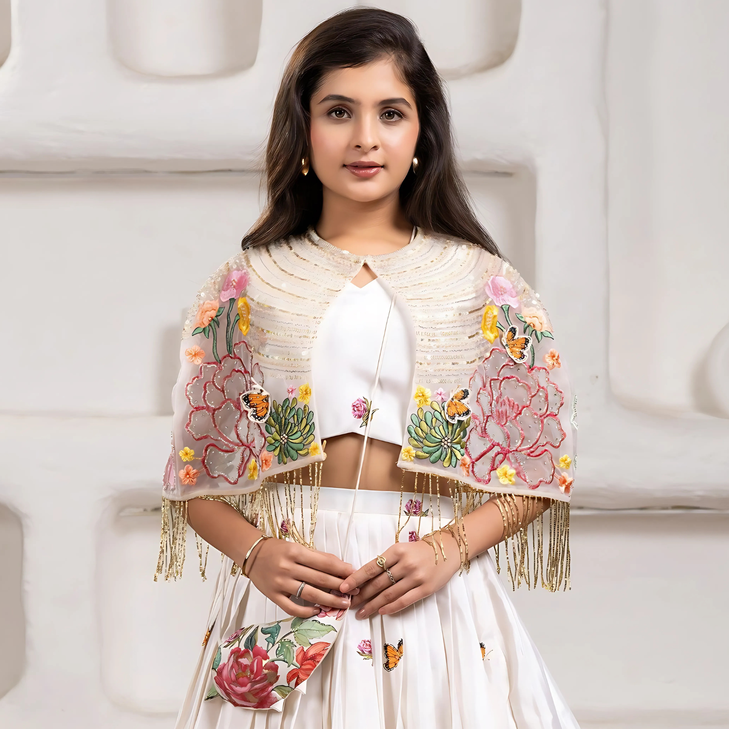 Create a magical bridal look with this stunning Fawn georgette lehenga choli. Adorned with intricate sequins and thread embroidery work, it features an embossed design lace for a sophisticated touch. The set includes a gracefully