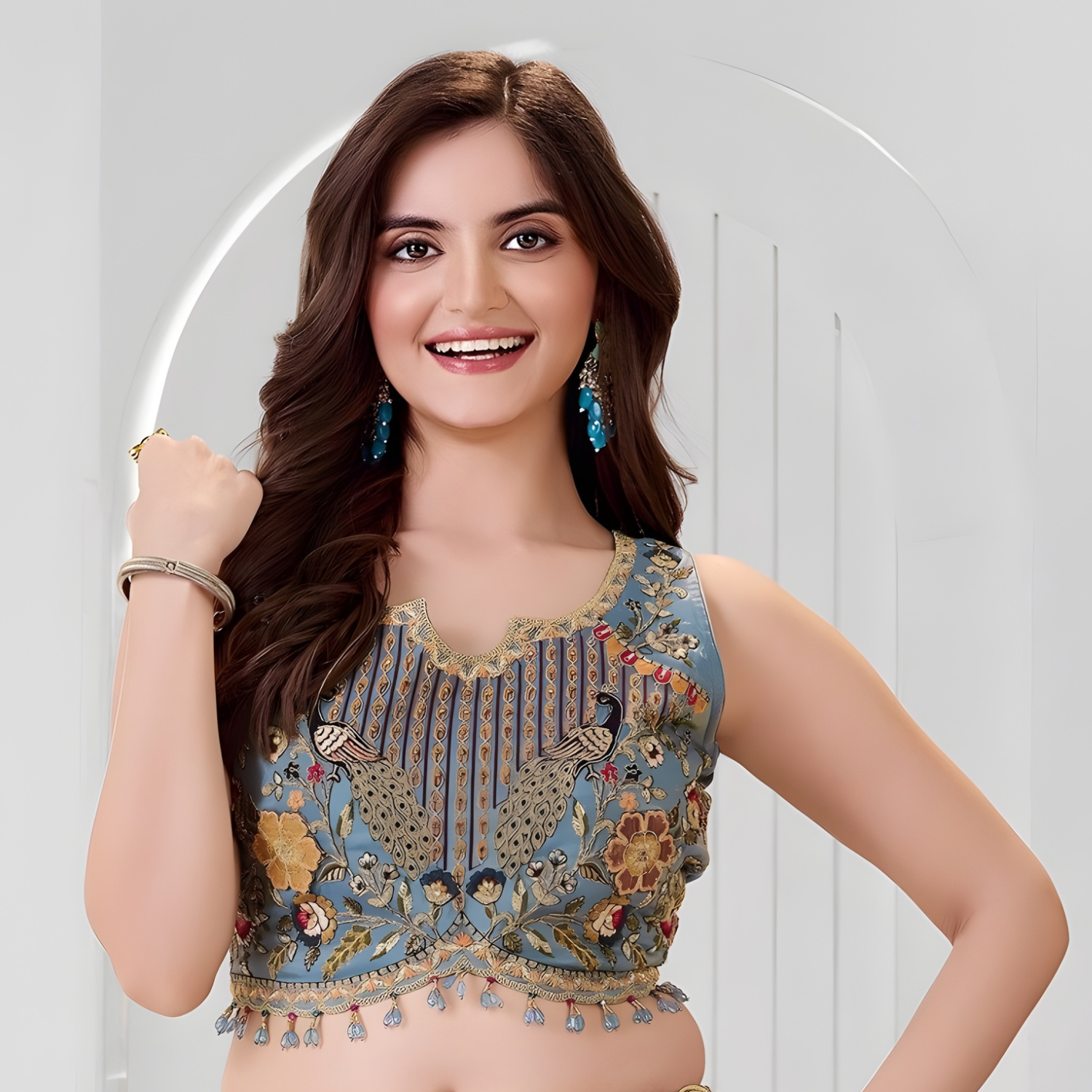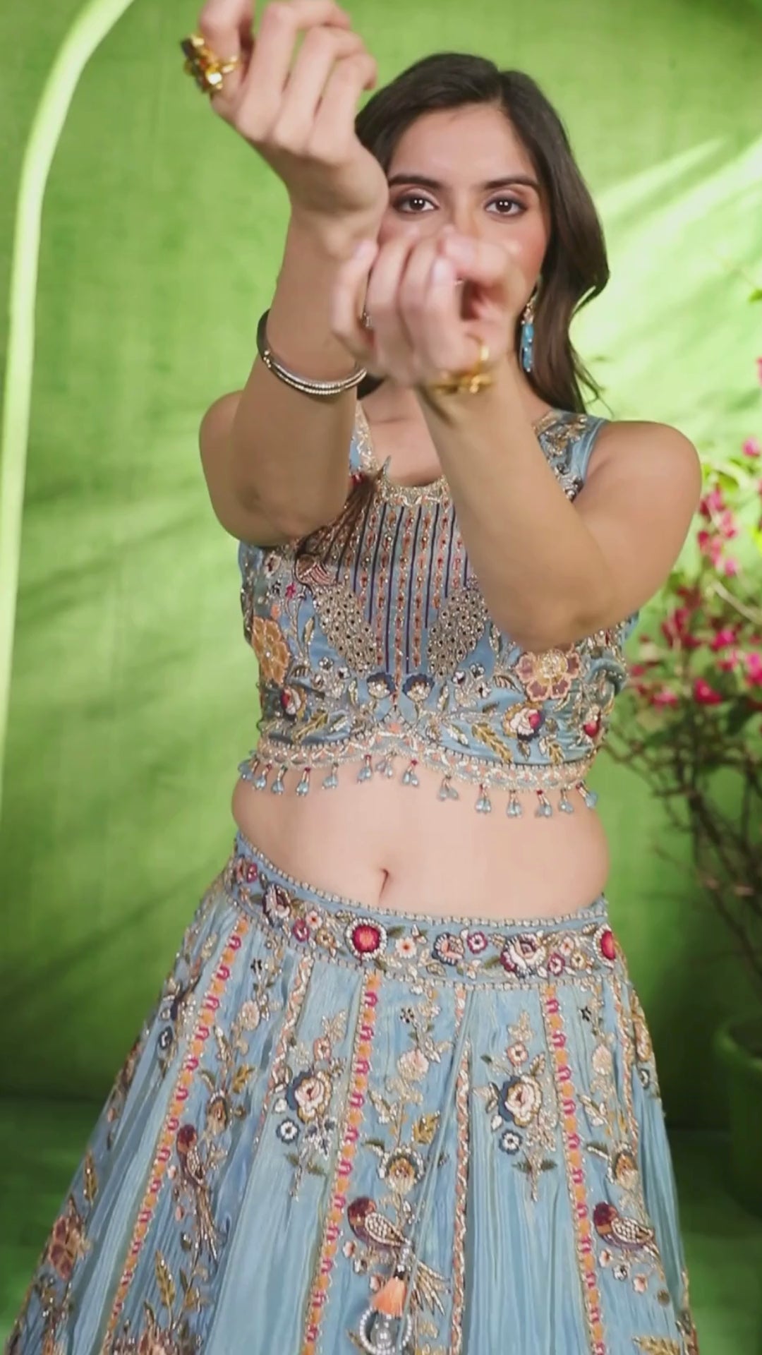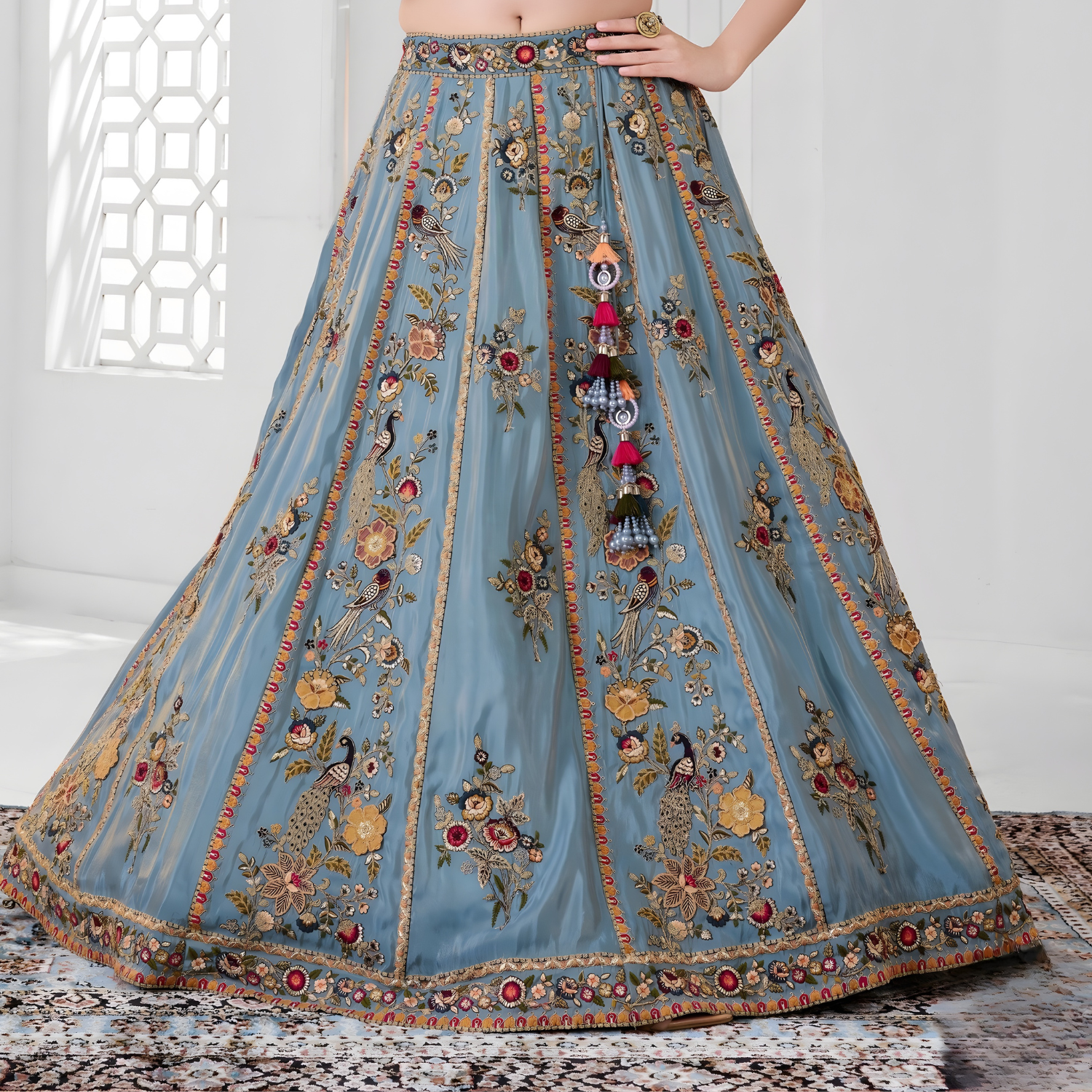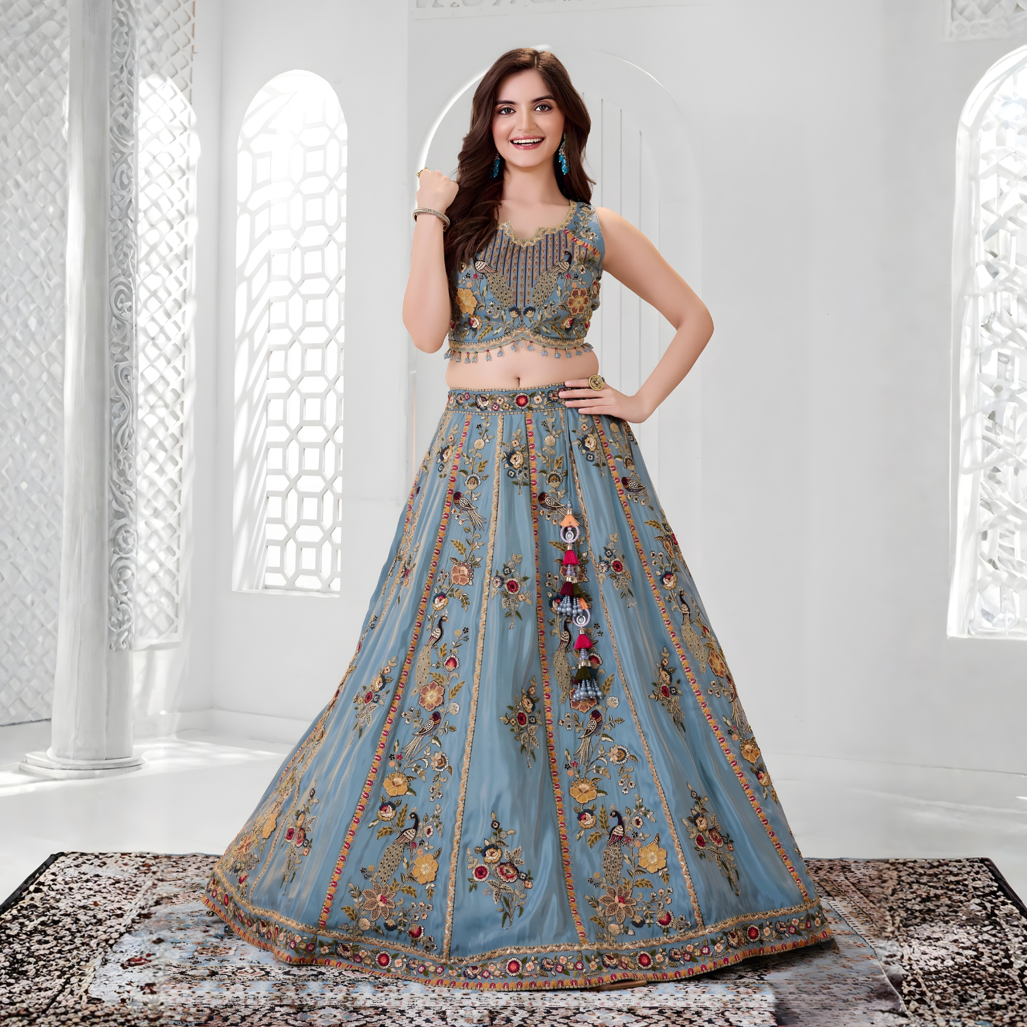 Stunning sky blue lehenga choli set featuring intricate embroidery and matching dupatta. Perfect for weddings and celebrations.