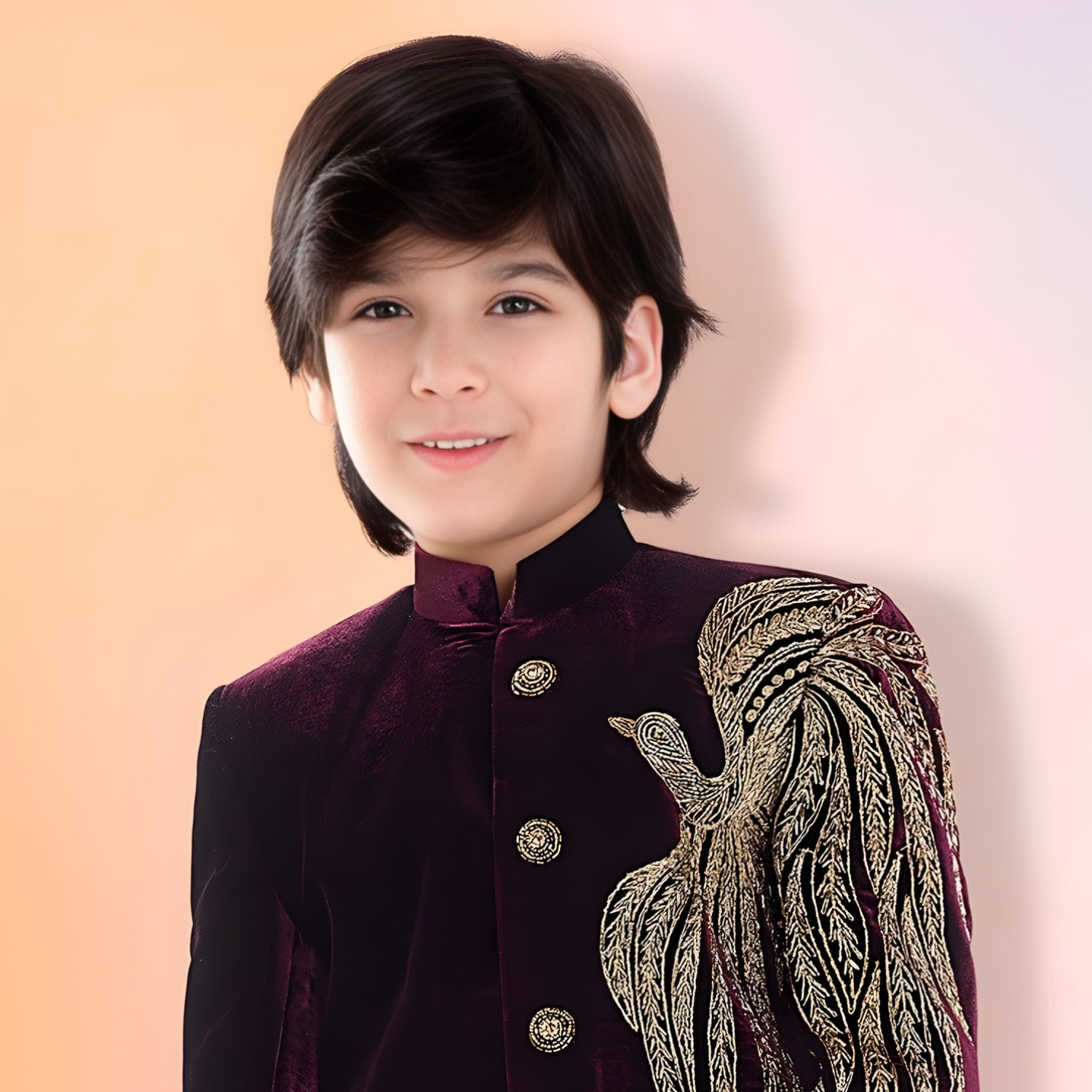 Sophisticated wine sherwani paired with cream pyjama. Perfect for celebrations, weddings, and festive occasions. Premium crafted elegance for young gentlemen.
