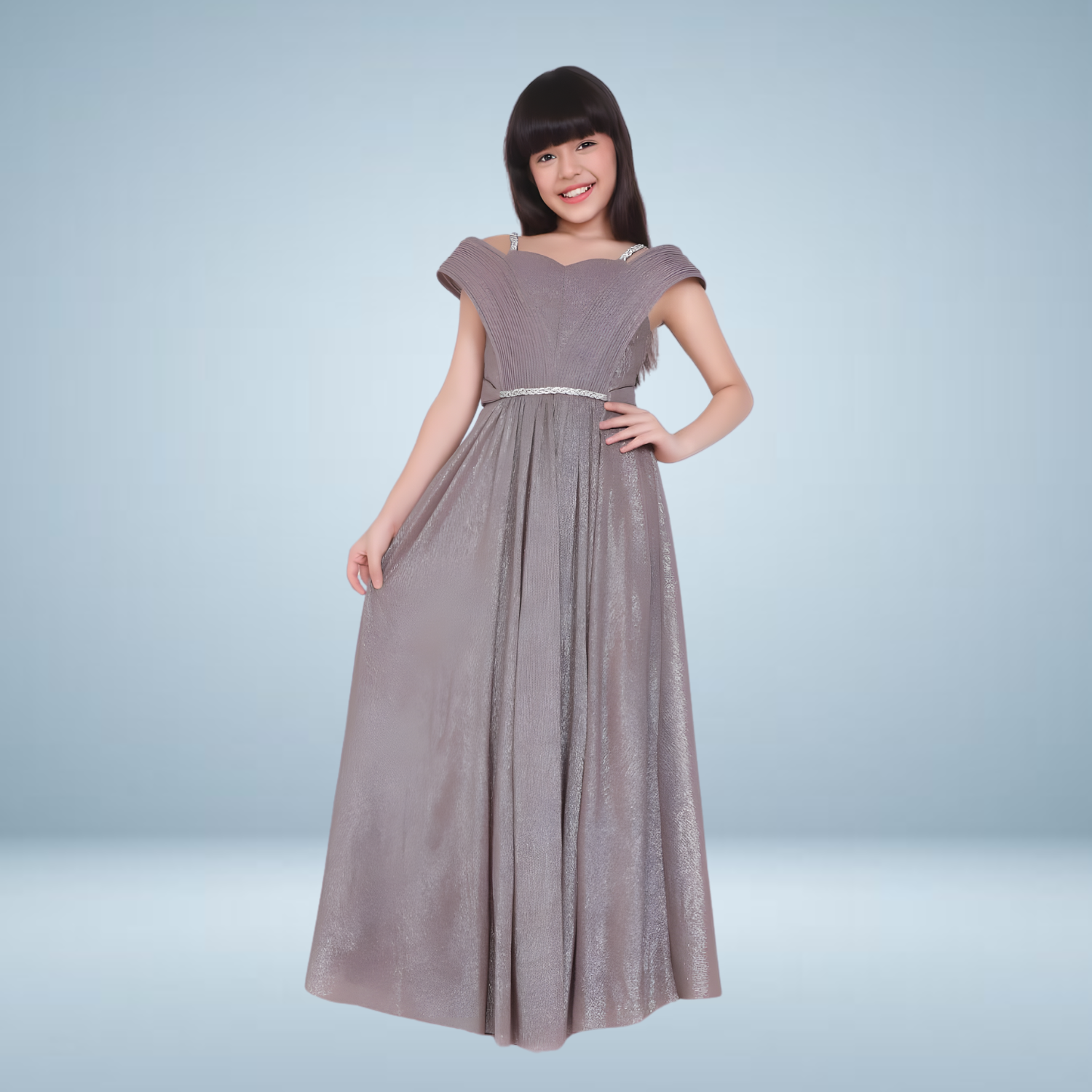 Stunning Fawn-hued gown adorned with shimmering sequins. Perfect for celebrations and special occasions. Elegant design ensures your girl stands out beautifully.