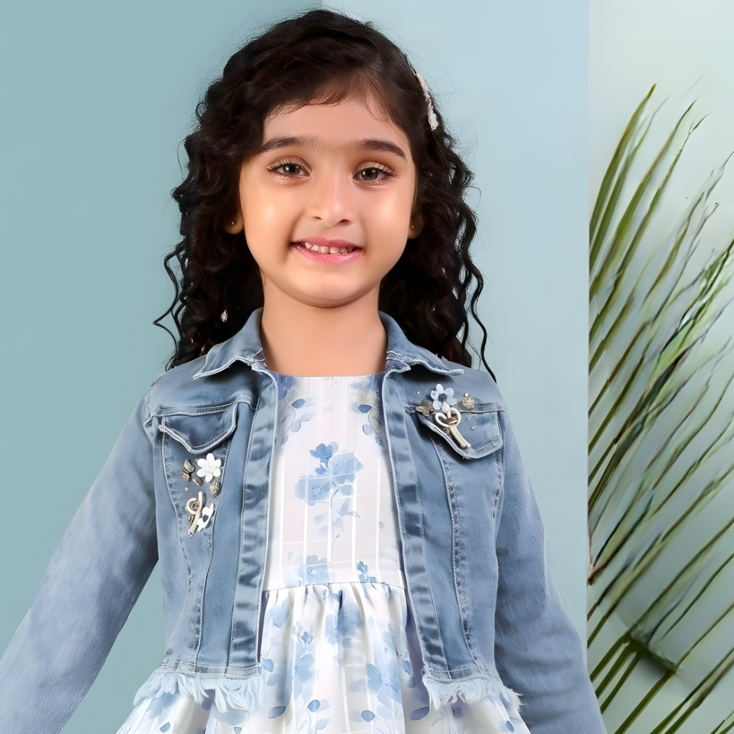 Girls Knee Length Floral Printed Frock Denim with Jacket