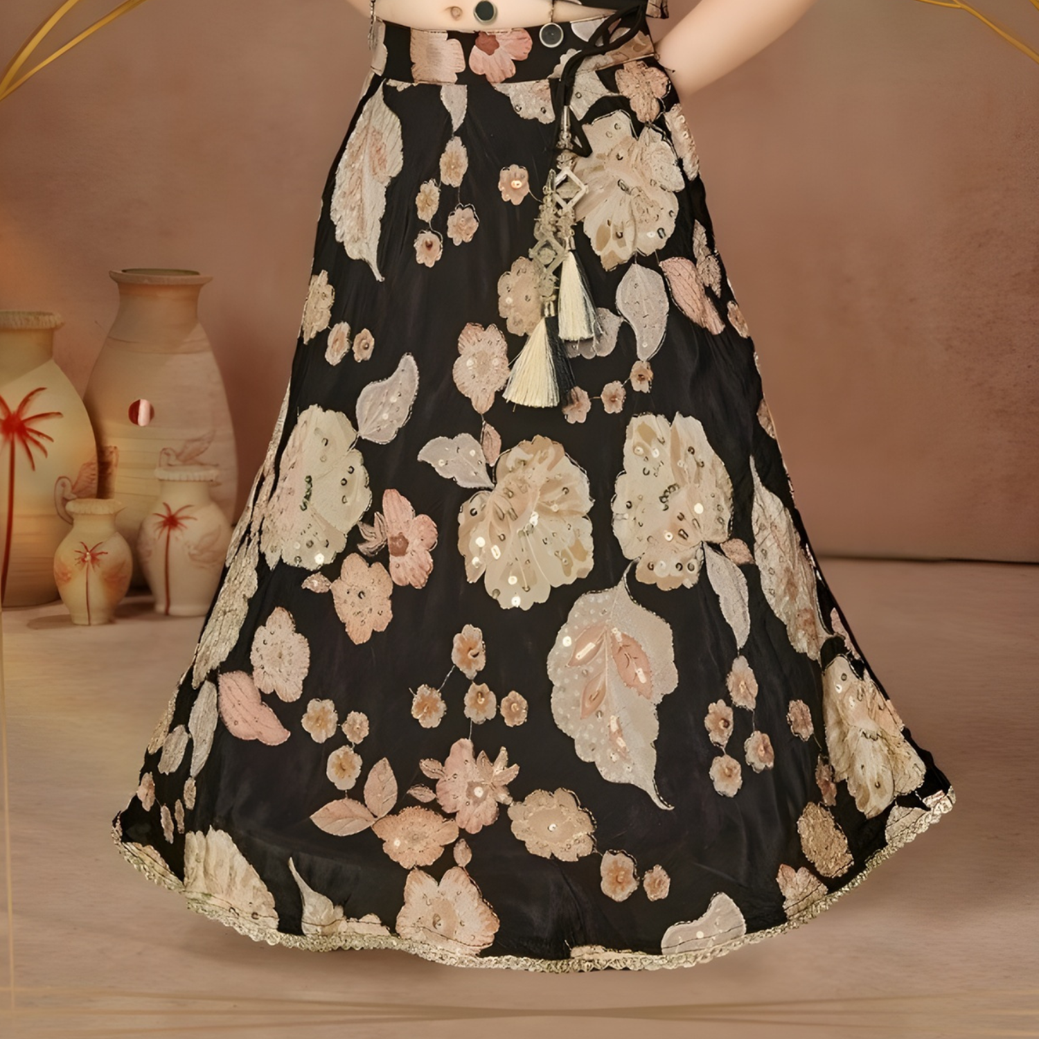 Elegant black lehenga and choli set for girls. Traditional Indian ethnic wear featuring intricate design, perfect for celebrations and special occasions.