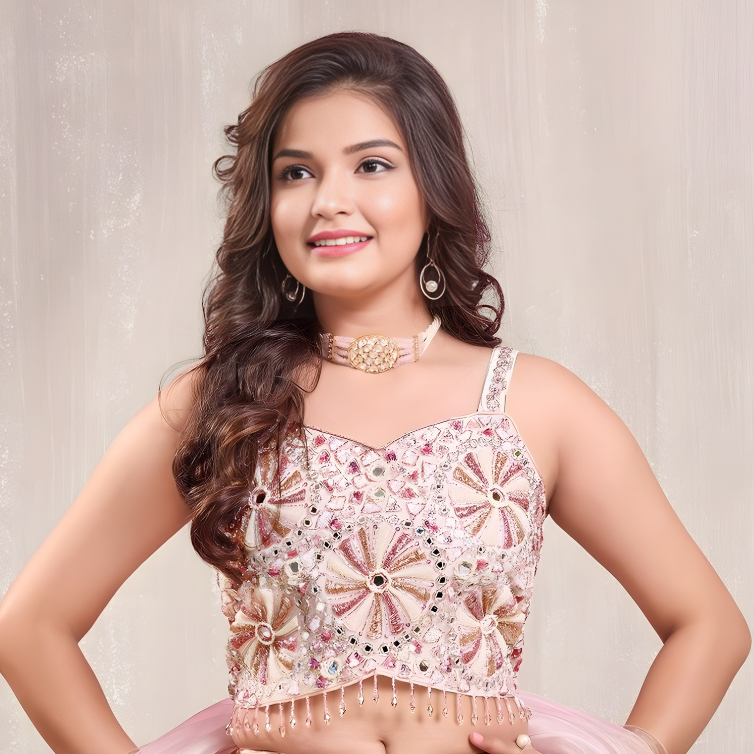 Stunning pink lehenga set featuring intricate mirror-work embellishments on the crop top. Perfect for celebrations and special occasions.