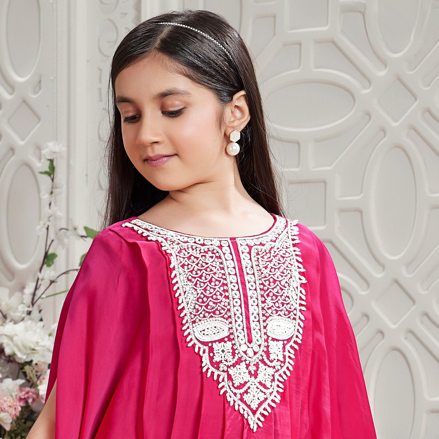 This Girls Rani set features a beautifully embroidered and sequined top paired with a comfortable dhoti bottom, blending traditional charm with modern style. Perfect for festive occasions, it offers both elegance and ease of movement for your little one.