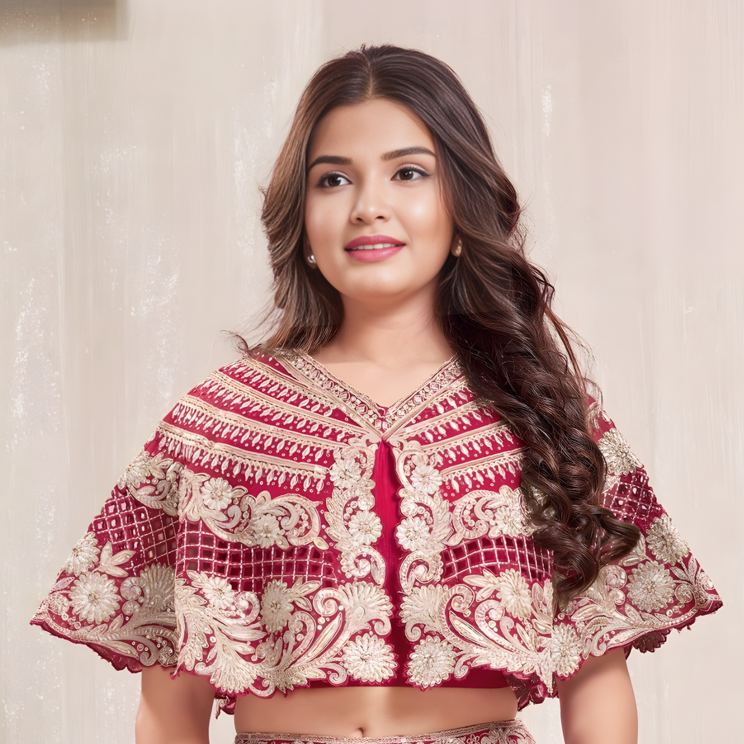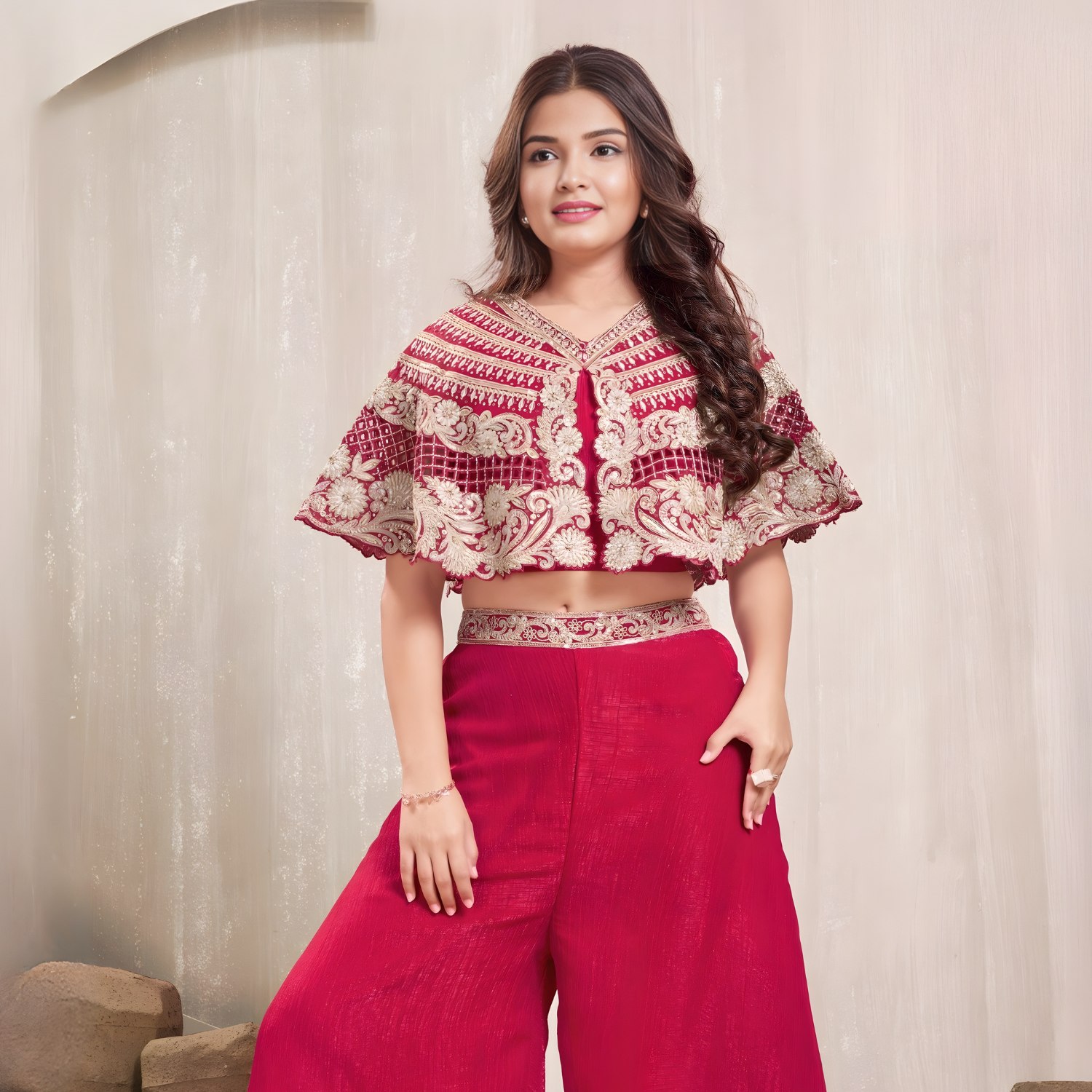 Elegant rani-hued palazzo set featuring a trendy poncho-style crop top. Perfect for festive occasions and ethnic celebrations.