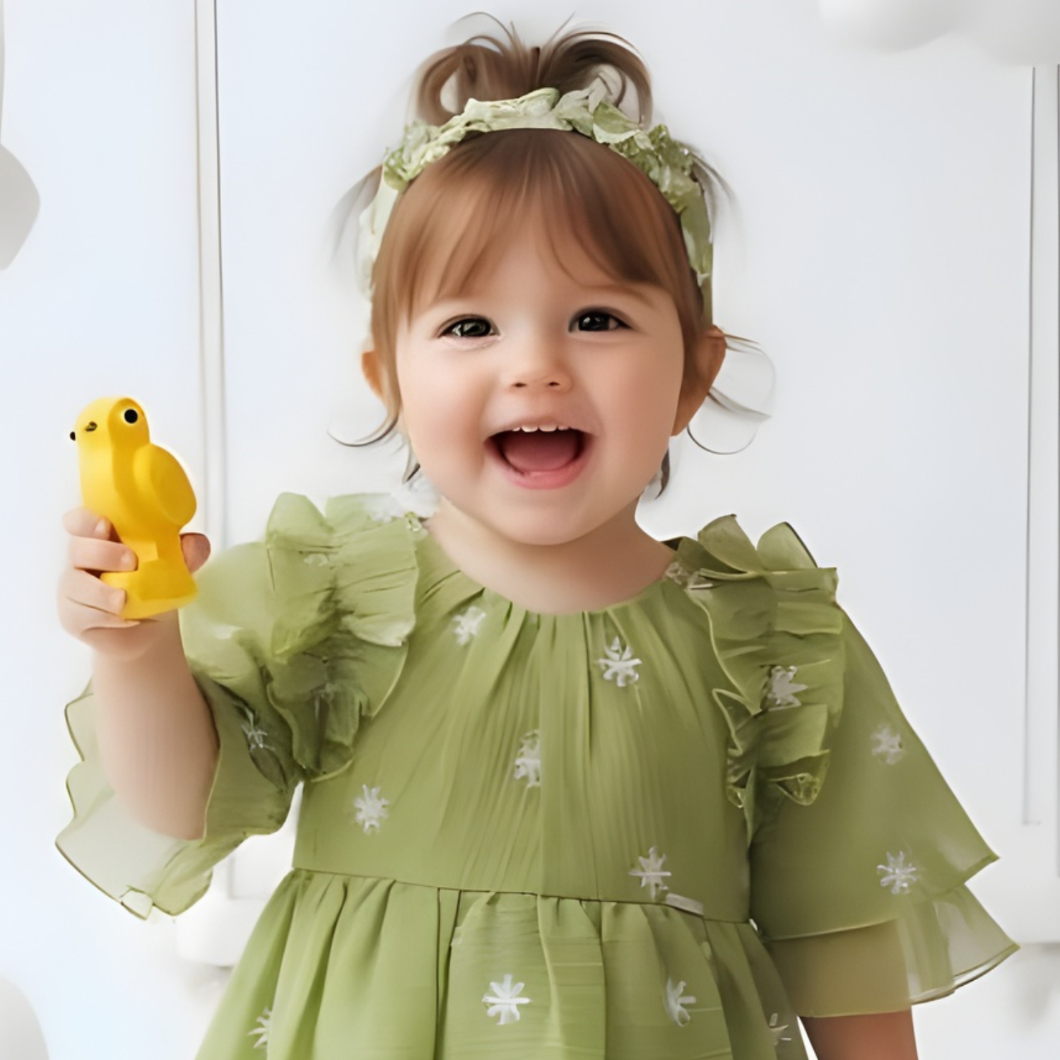 This girls' short-sleeved green party frock combines elegant design with comfortable fabric, ideal for celebrations. Its vibrant color and tailored fit make it perfect for memorable occasions.