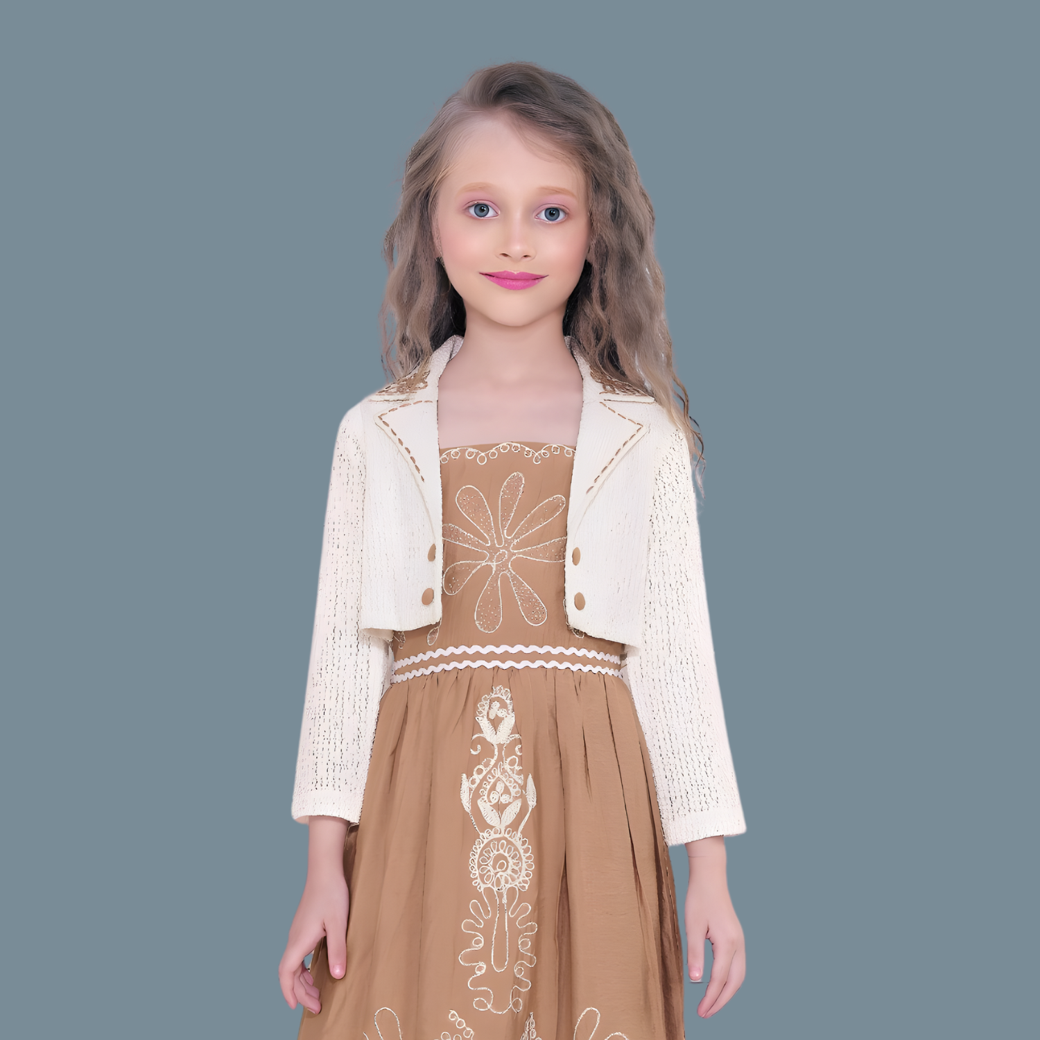 Elegant fawn frock paired with matching overcoat for girls. Perfect for special occasions and festive celebrations with timeless style.