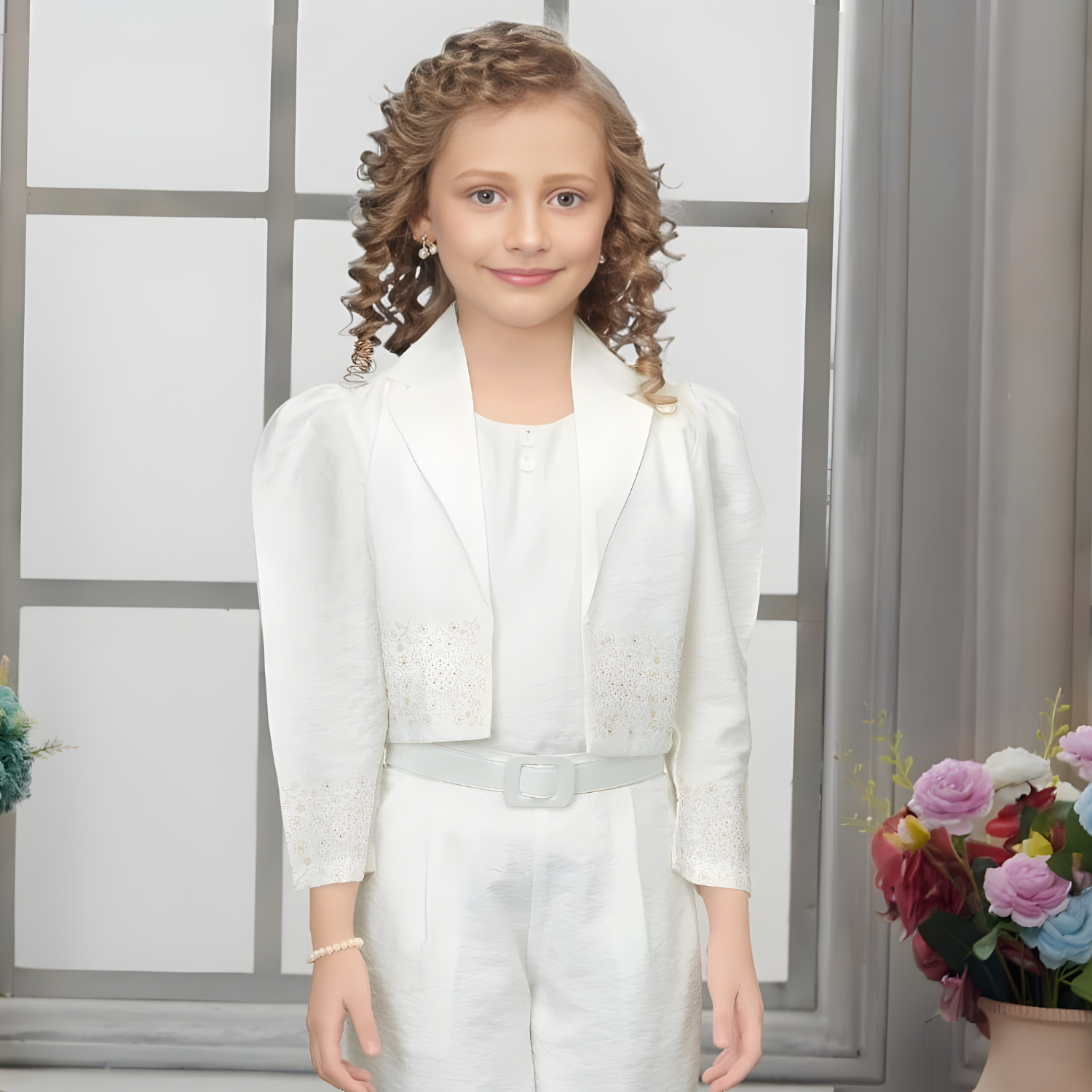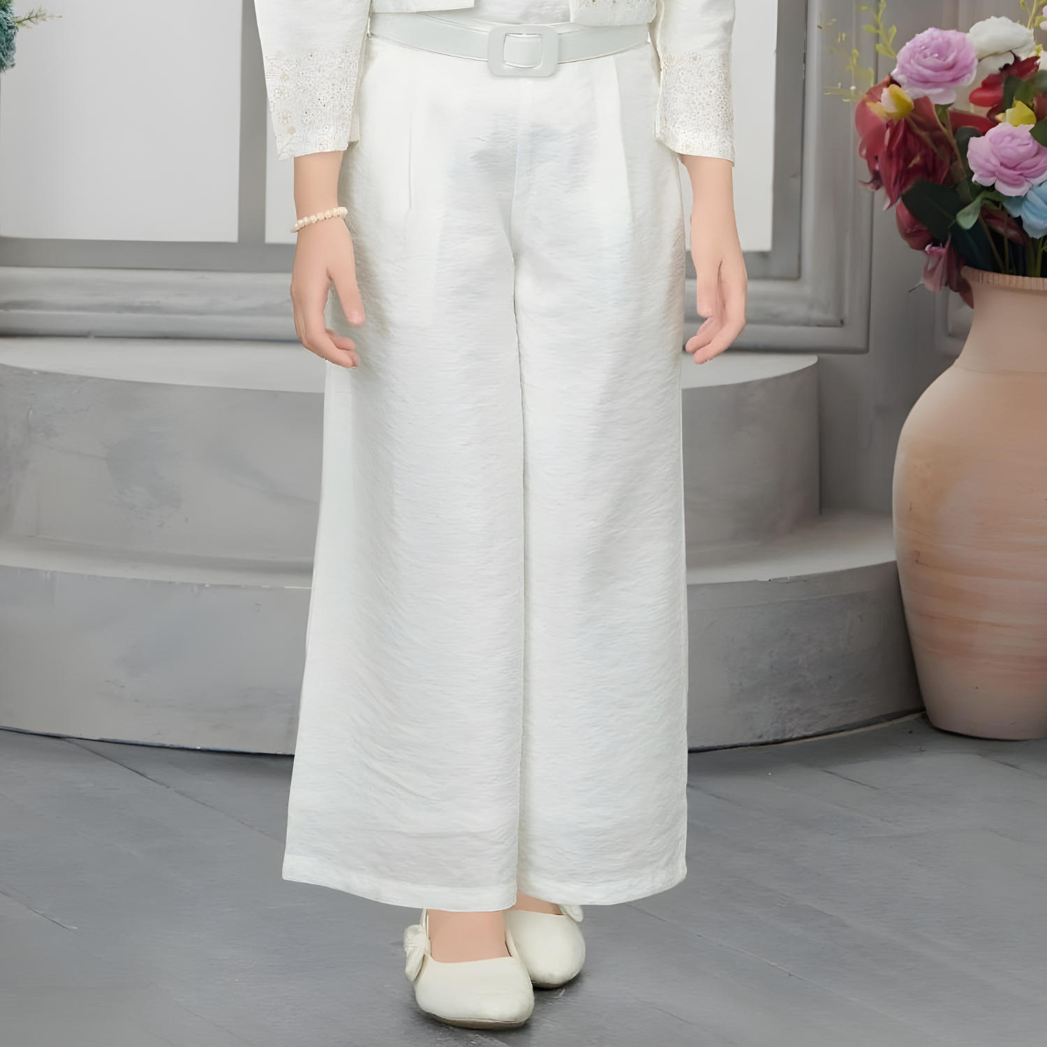 Girls White knit palazzo set with Jacket