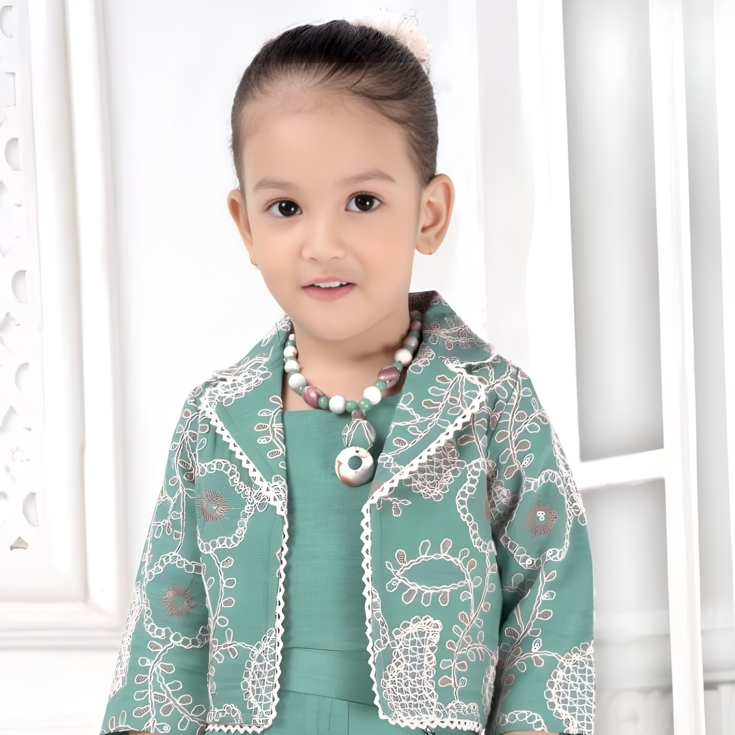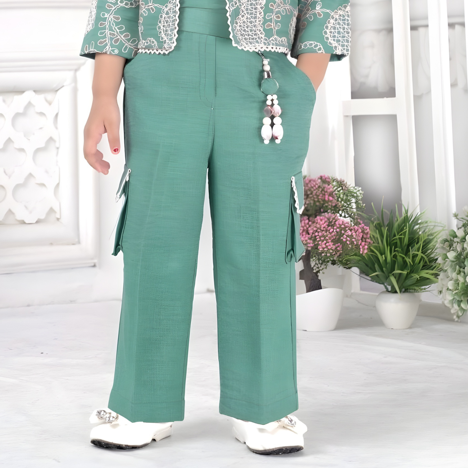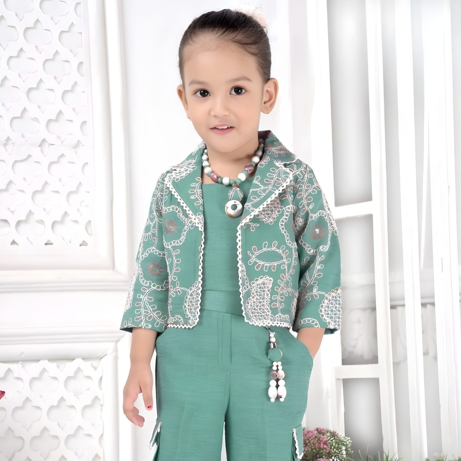 green embroidered pant set, featuring an expertly tailored jacket that combines traditional craftsmanship with contemporary style. The intricate embroidery detailing adds an elegant touch, making it ideal for festive occasions,