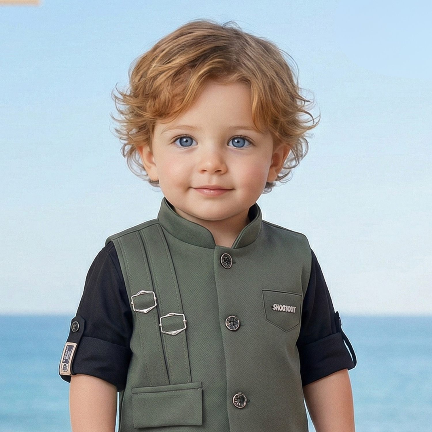 Smart three-piece set for boys featuring a stylish green waistcoat paired with a coordinating shirt and pants. Perfect for formal occasions and celebrations.