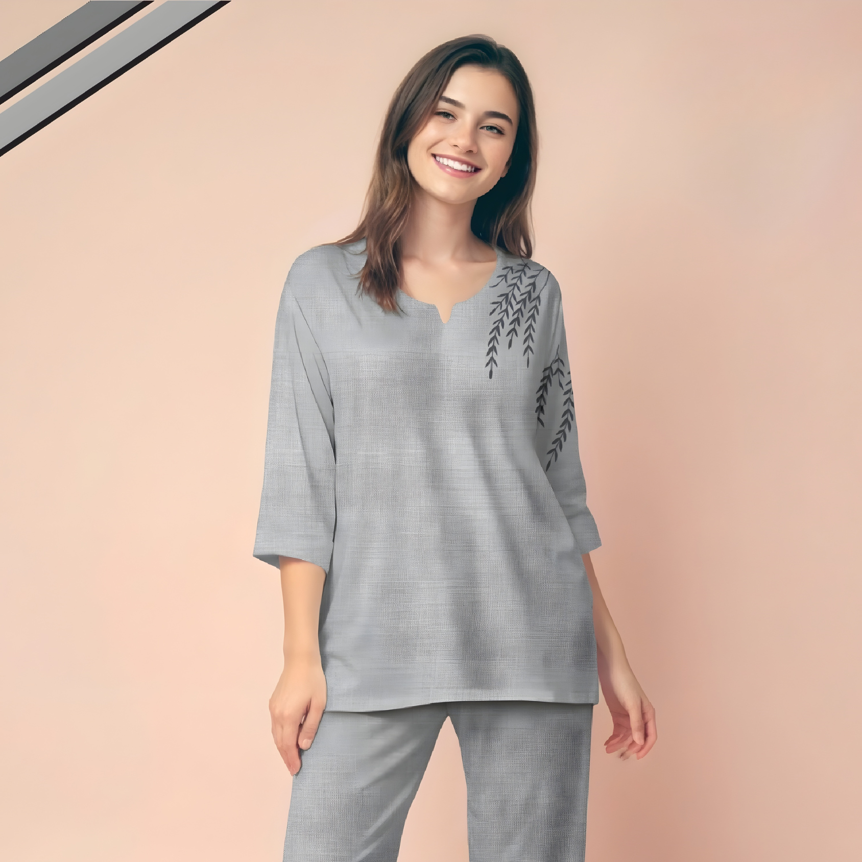 Soft grey cotton night suit set designed for ultimate comfort and breathability. Perfect for restful sleep with a relaxed fit.