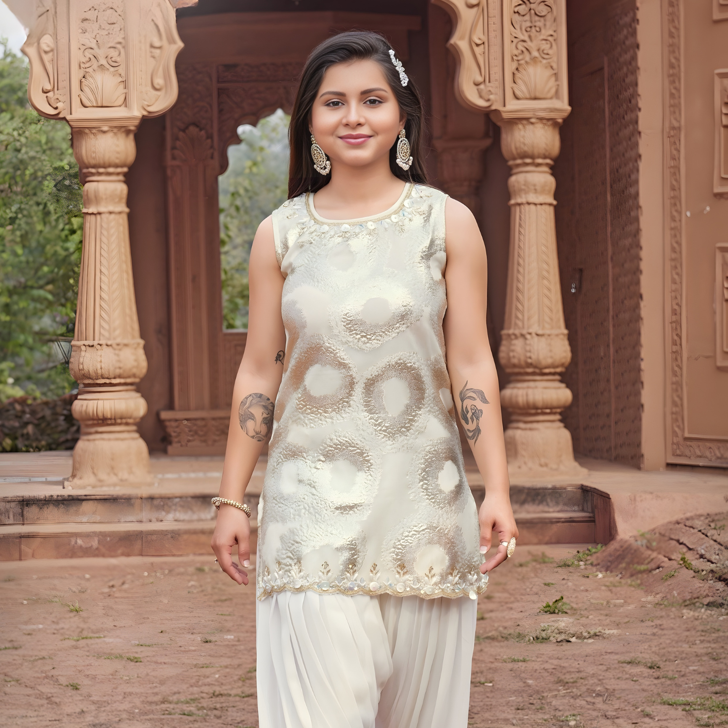 Elegant ivory kurti featuring gold textured details, paired with cream patiala pants. Perfect traditional outfit for girls' special occasions and celebrations.