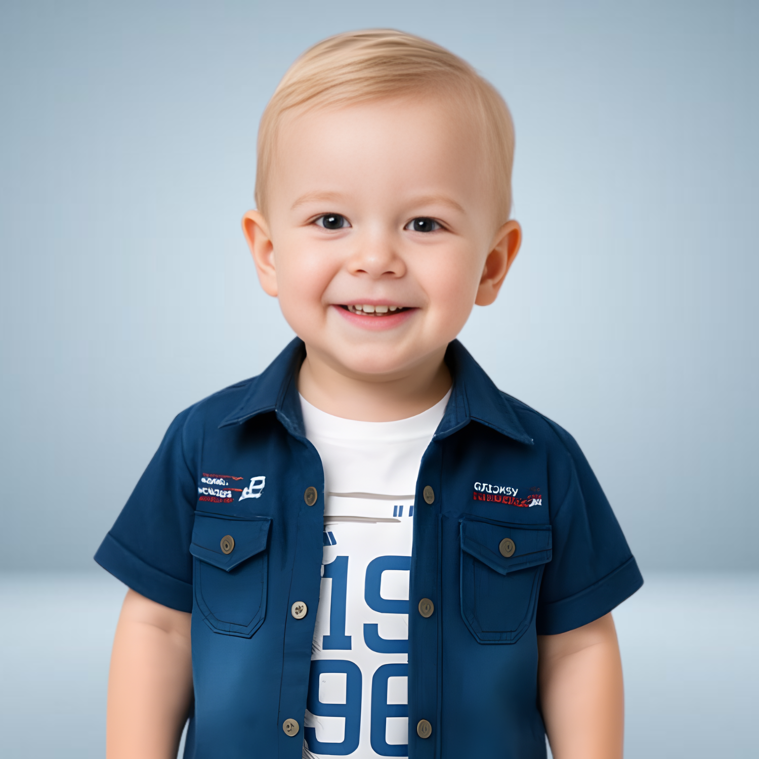 Classic blue denim baba-suit for boys. Comfortable, durable fabric with traditional styling. Perfect for casual wear and special occasions.